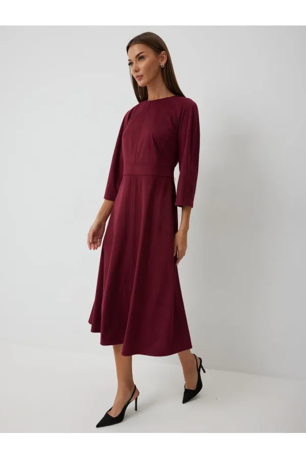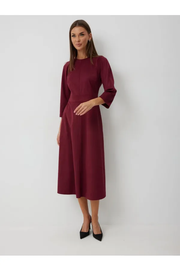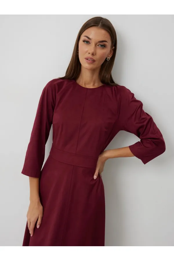 Платье женское полуприлегающего силуэта без подкладки, длиной до середины икры. Платье с отрезным лифом. По переду лиф с центральным швом, отрезными бочками и нагрудными вытачками. Спинка лифа с центральным швом и отрезными бочками. Отрезная юбка по переду и спинке со средним швом. Юбка соединяется с лифом отрезным поясом. Рукав-реглан полной длинны. Низ рукава и платья обработан швом «в подгибку». Горловина платья обработана обтачкой. По среднему шву спинки располагается застежка-молния.