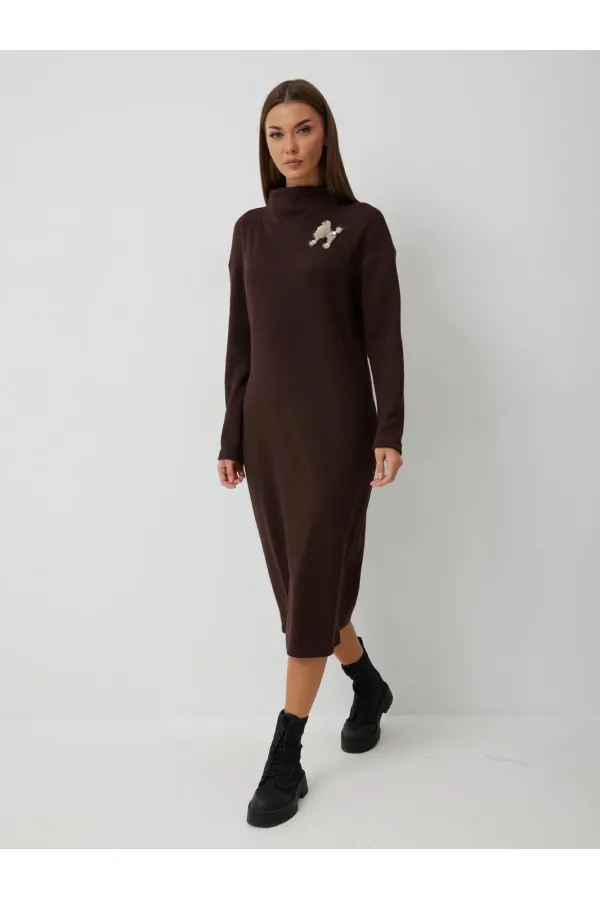 Платье трикотажное полуприлегающего силуэта с карманами в боковом шве. Длина платья до середины икры. Платье с цельнокроеной горловиной и спущенной линией плеча. Спинка со средним швом. Платье дополнено съемным авторским декором.