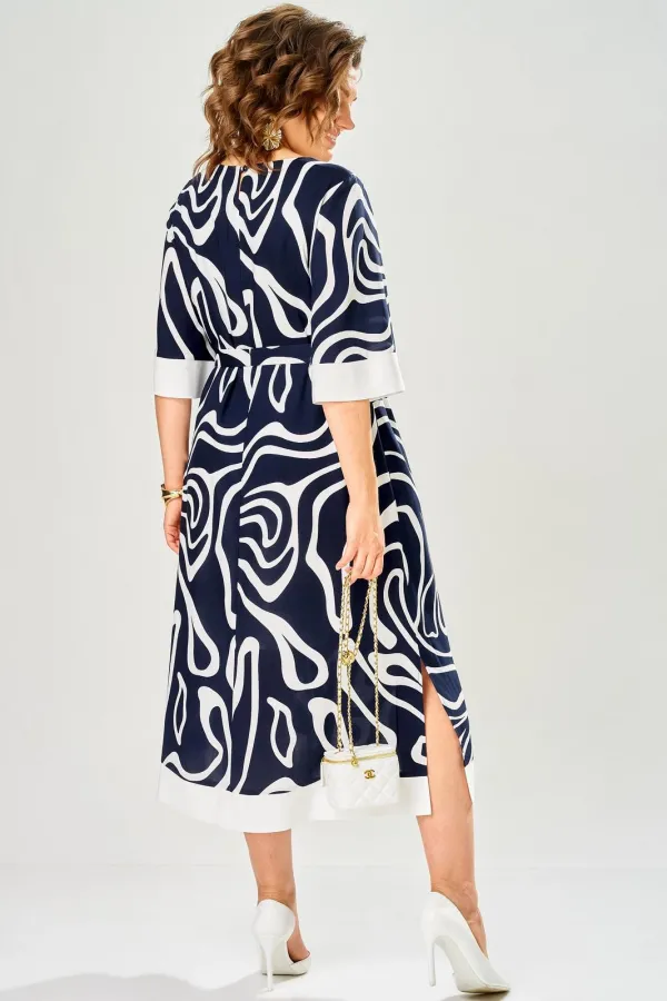 Платье из лёгкой вискозы. На тонкой подкладке. Силуэт прямой, к низу слегка расширен. Нагрудные вытачки. Горловина овальная. Рукав втачной, чуть расширен к низу. По низу рукава и платья отделка по низу однотонной светлой тканью. Платье без застёжки. Мягкий съёмный пояс из основного полотна.