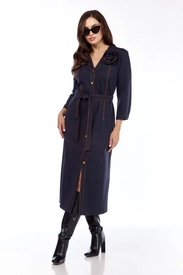 Платье выполнено из трикотажного полотна. V образный вырез горловины, втачной рукав и застежка на пуговицы. По переду и спинке рельефы, карманы в боковых швах. Пояс и декоративный цветок в комплекте .