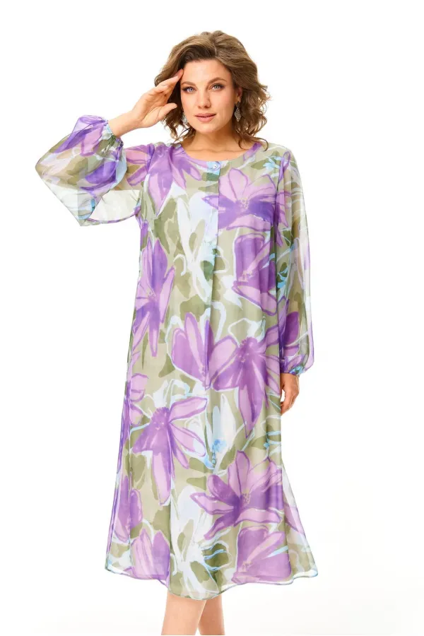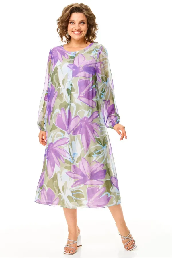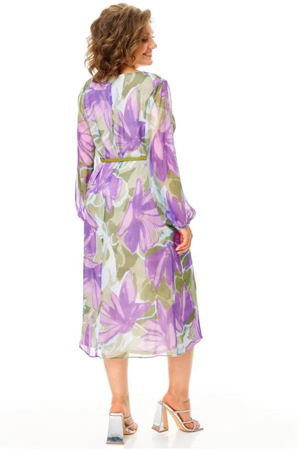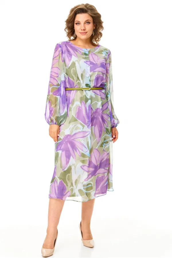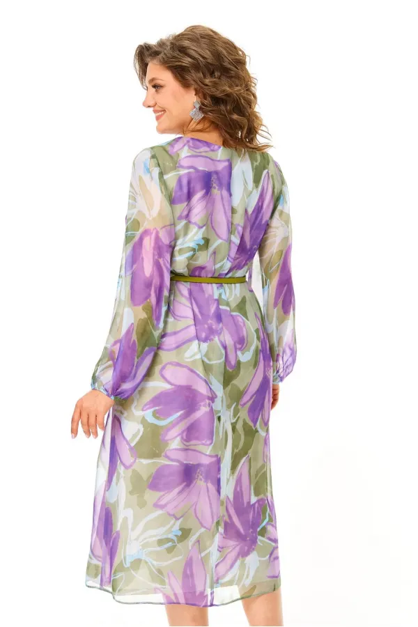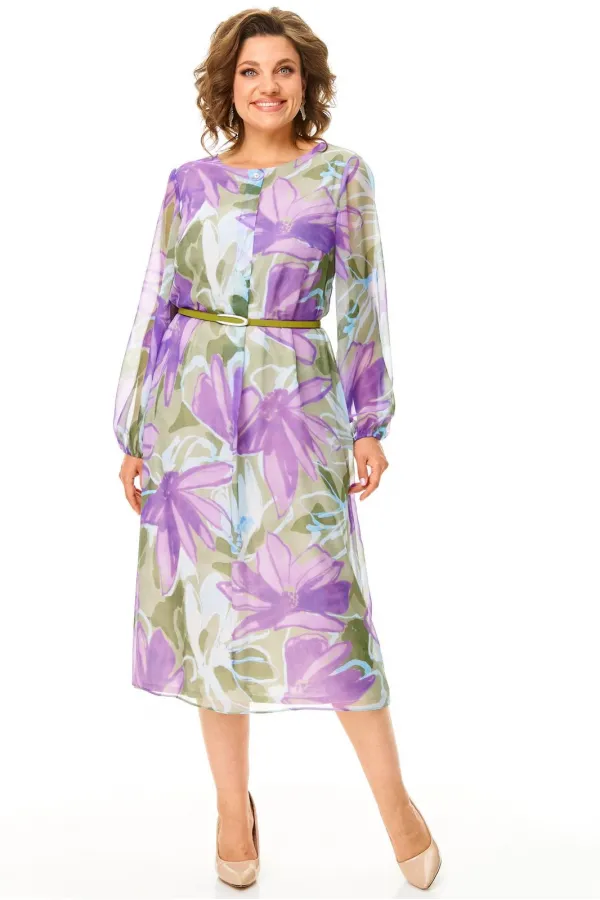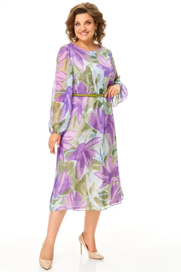 Платье выполнено из шифона с цветочным принтом. Силуэт прямой, чуть расширен к низу. По переду в горловину входит складка, складка частично настрочена. По переду есть нагрудные вытачки. Перед и спинка на трикотажной подкладке. Рукав втачной, прямой, к низу расширен. Низ рукава на резиночке. Спинка со средним швом, без особенностей. Съёмный пояс в комплекте.