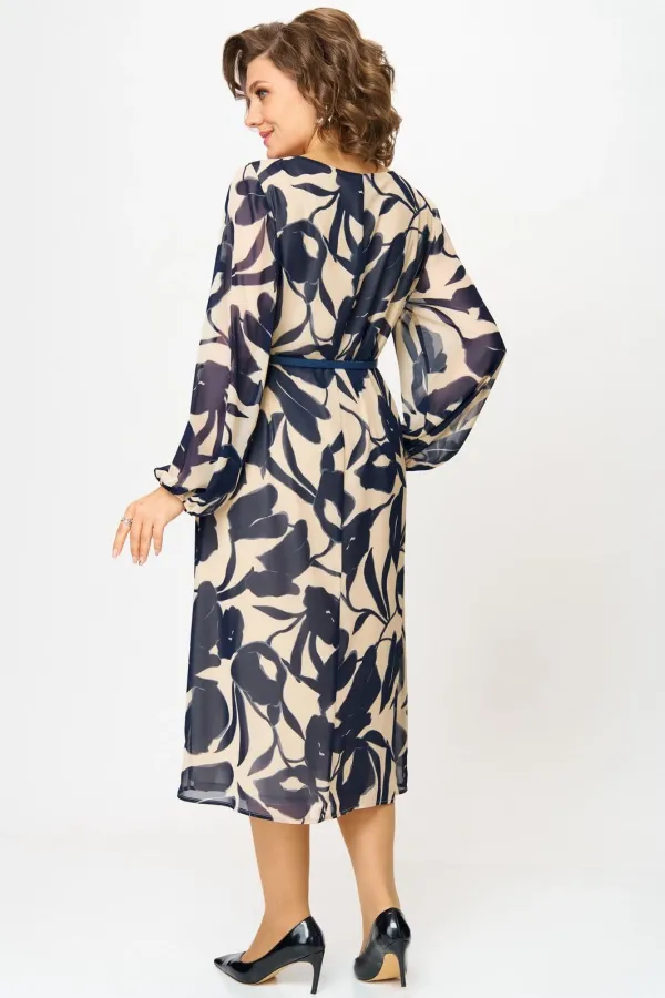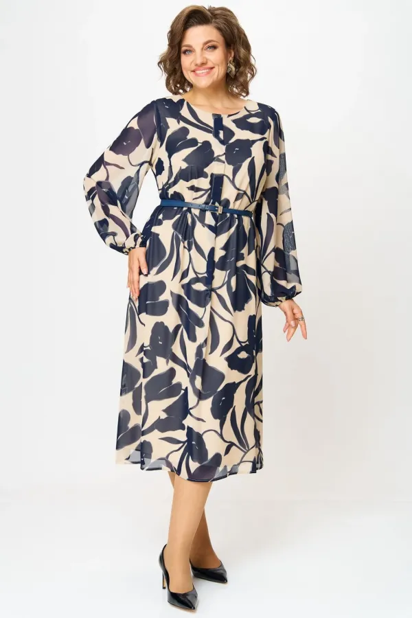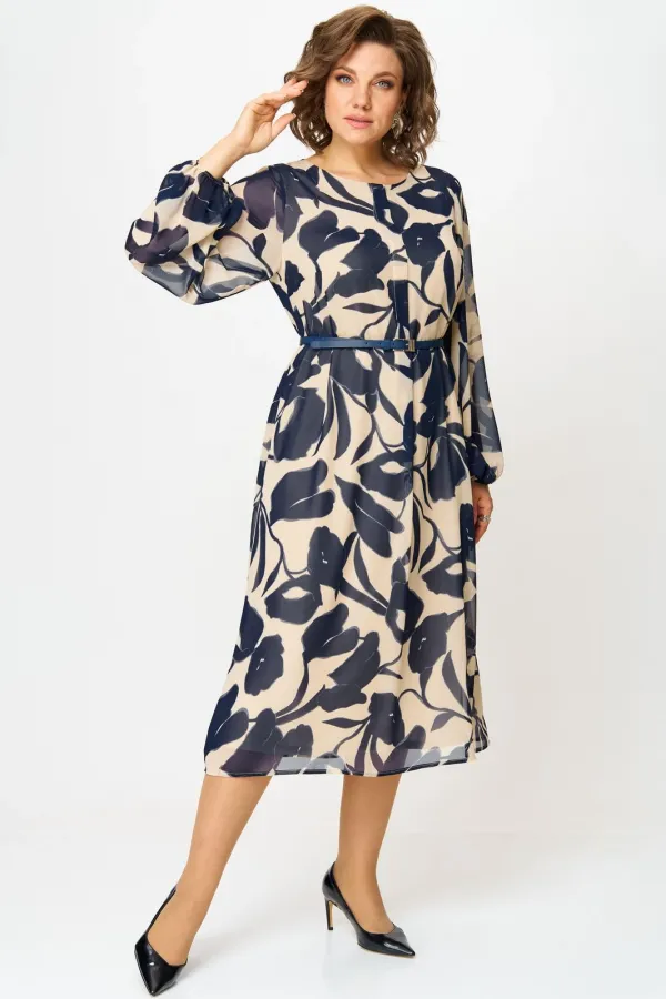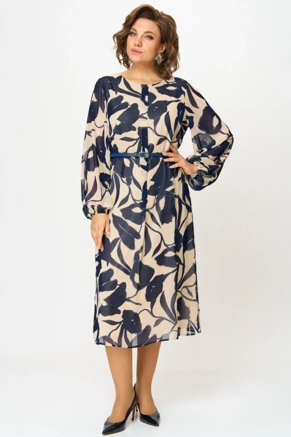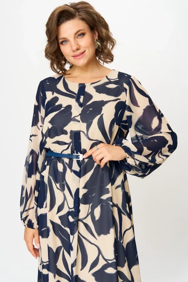 Платье выполнено из шифона с цветочным принтом. Силуэт прямой, чуть расширен к низу. По переду в горловину входит складка, складка частично настрочена. По переду есть нагрудные вытачки. Перед и спинка на трикотажной подкладке. Рукав втачной, прямой, к низу расширен. Низ рукава на резиночке. Спинка со средним швом, без особенностей. Съёмный пояс в комплекте.
