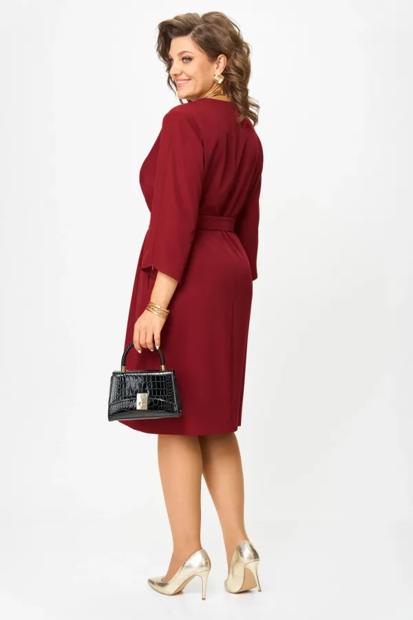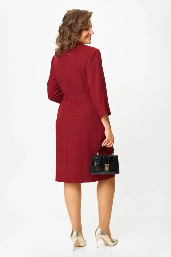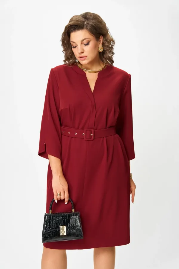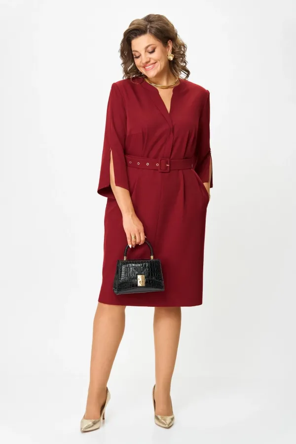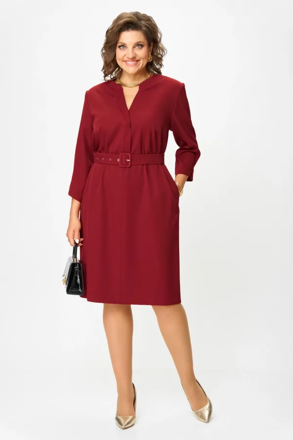 Платье женское. Без подкладки. Выполнено из плательной ткани средней плотности. Силуэт прямой. Рукав втачной. В рукаве в среднем шве вставлена потайная молния. Низ рукава фигурный. Вырез горловины обработан небольшим воротником и планкой. Спинка прямая со среднем швом без особенностей . Пояс в комплекте.
