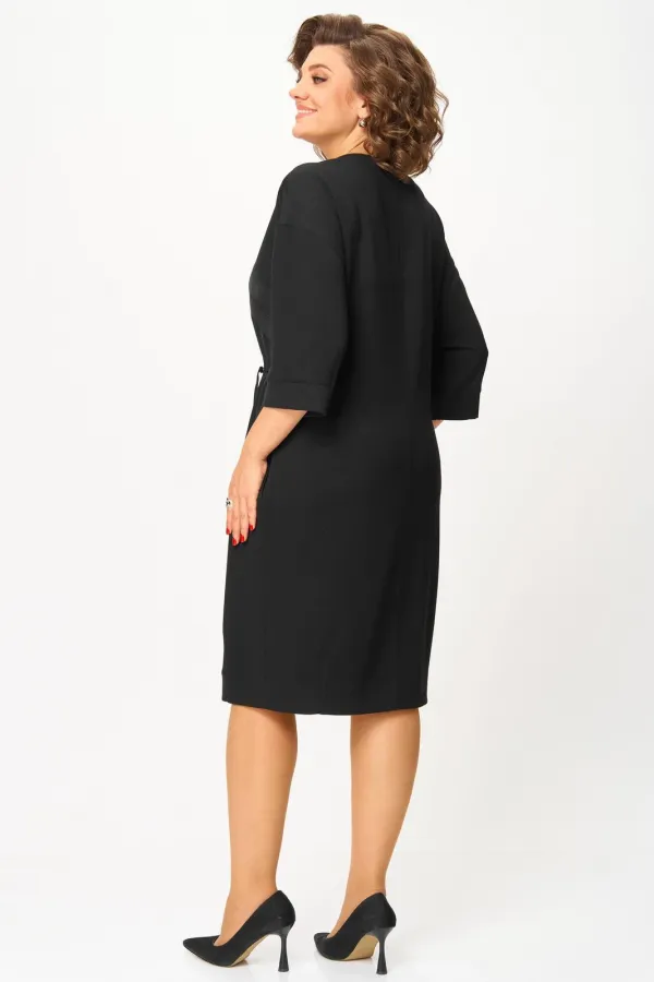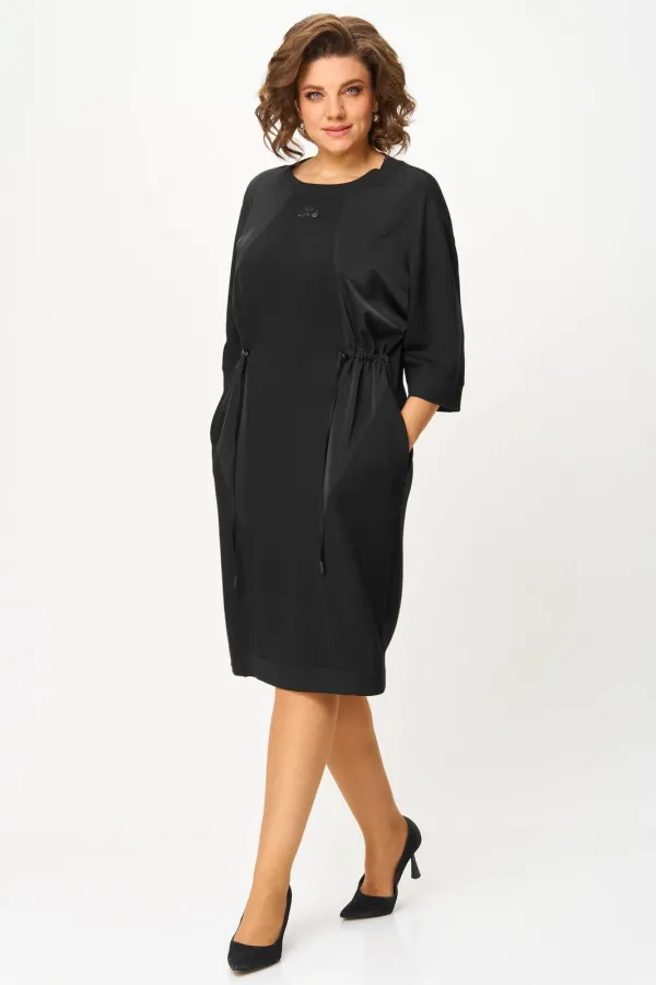 Платье женское, выполнено из трикотажного полотна с декоративными вставками из сатина в цвет основного полотна. Силуэт прямой, приталенный за счёт кулисы по передней части платья.