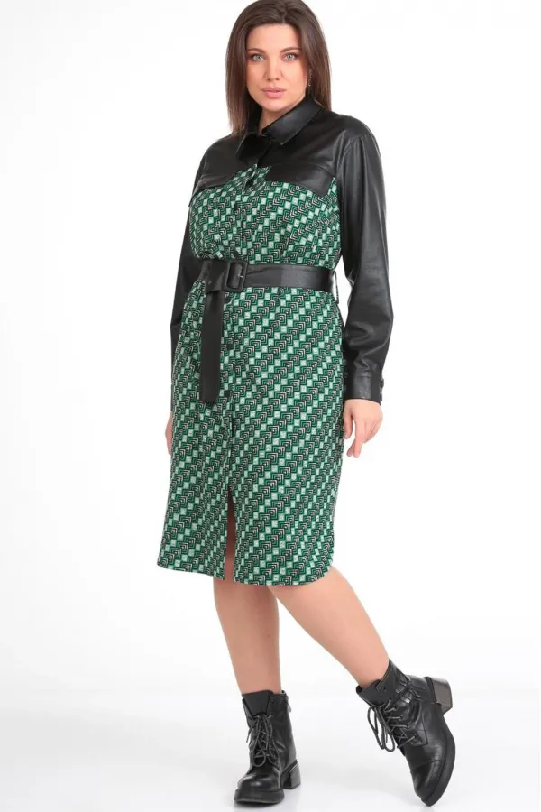 Платье женское полуприлегающего силуэта выполнено из сочетания двух фактур ткани : экокожи и трикотажа с воротником рубашечного типа и центральной бортовой застежкой на кнопки . Рукав втачной рубашечного типа собранный на манжету . Пояс из эко кожи в комплекте . Длина платья 108 см , длина рукава 58 см
