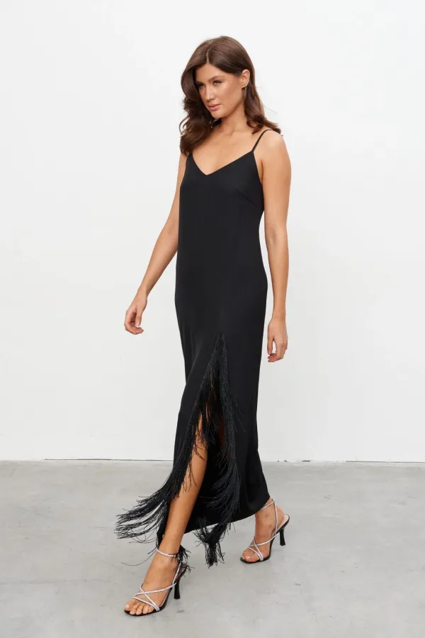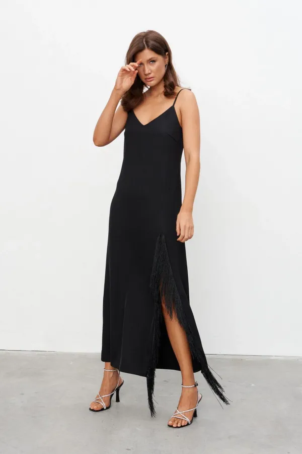 Платье-комбинация из струящейся ткани длиной макси с высоким разрезом, обрамлённым бахромой. Платье на бретелях длину которых можно регулировать. Застёжка на потайную молнию сбоку.