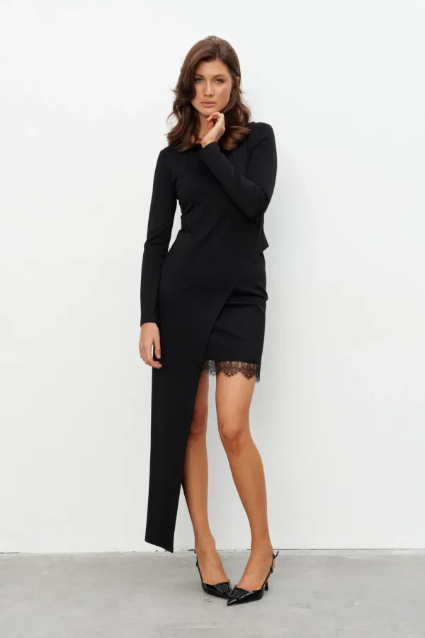 Комплект имитирующие платье из трикотажного полотна состоящий из джемпера с асимметричным низом и мини-юбки с кружевом. Джемпер прилегающего силуэта с длинным рукавом, вырез горловины - лодочка. Юбка на резинке по поясу.... Читать далее...