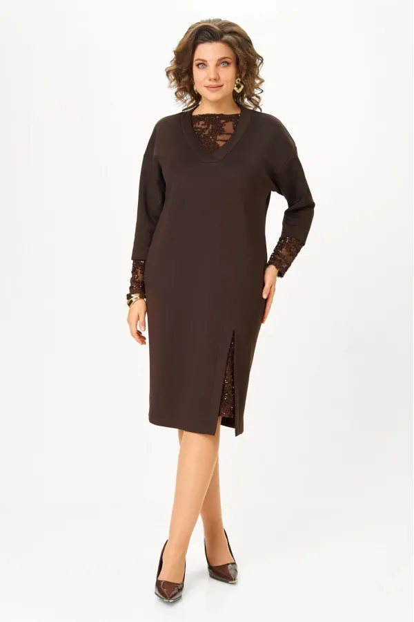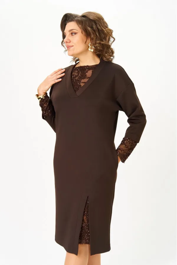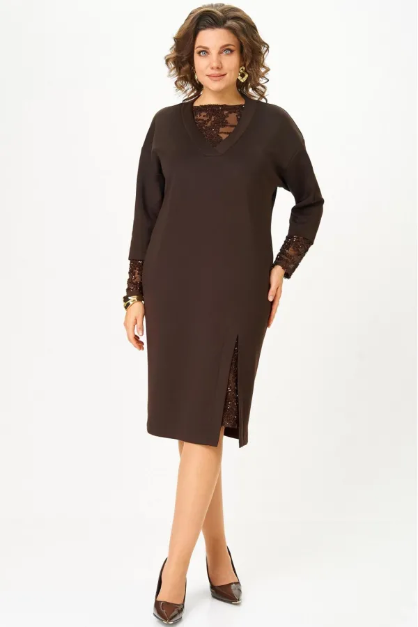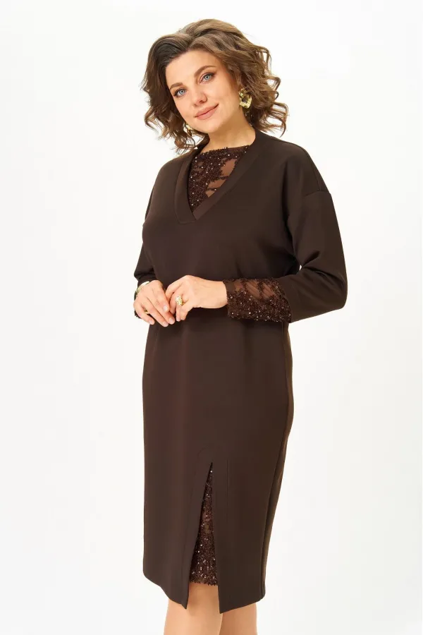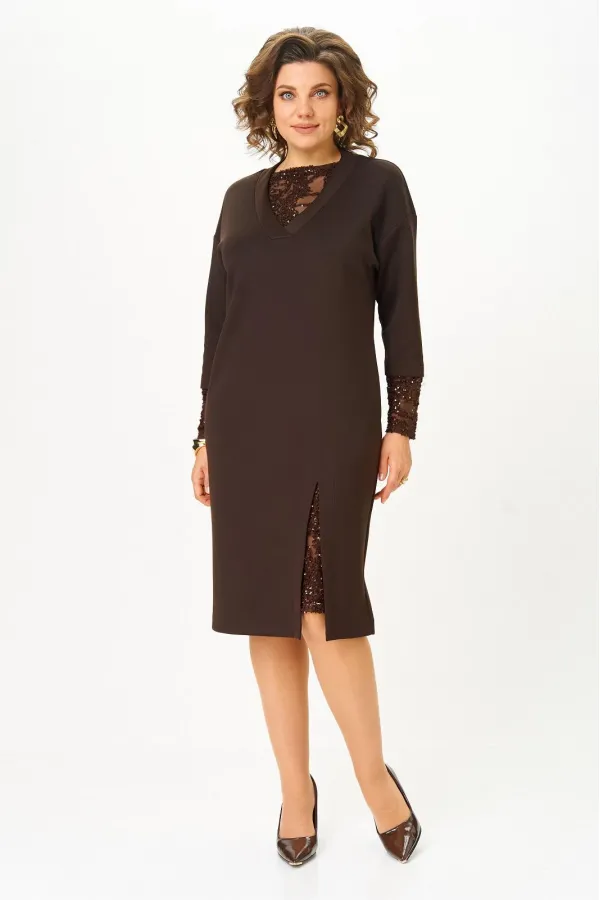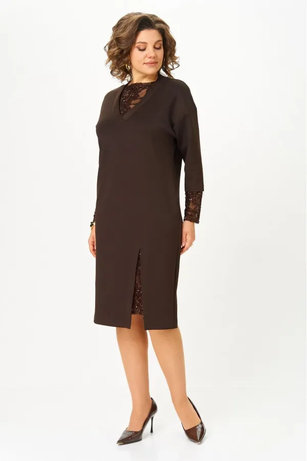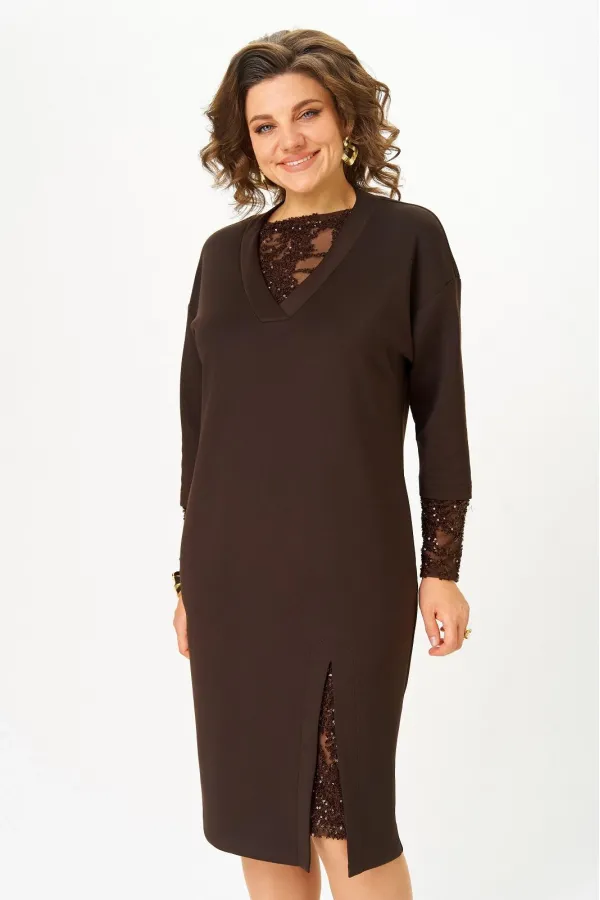 Нарядное женское платье из трикотажного полотна с добавлением хлопка и отделкой из трикотажной сетки с паетками. Силуэт прямой, слегка зауженный к низу, свободного облегания, длиной чуть ниже колена, вырез горловины У-образный с планкой и вставкой из сетки с паетками, линия плеча опущена, рукав длинный, по низу рукава вставка из аналогичной отделочной ткани, внизу по переду ассиметричная декоративная вставка также из сетки с паетками.