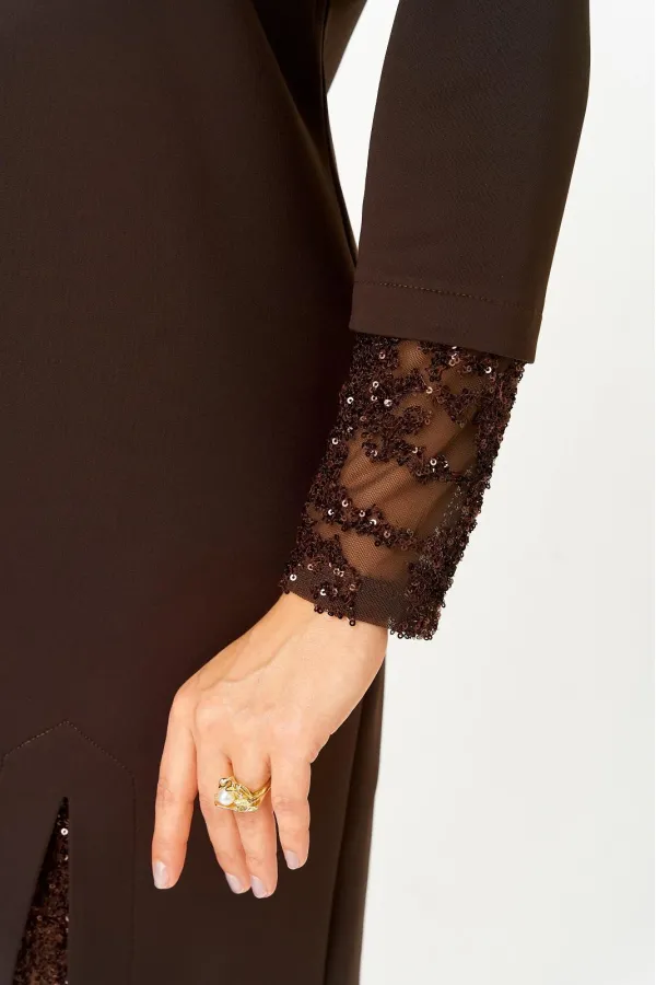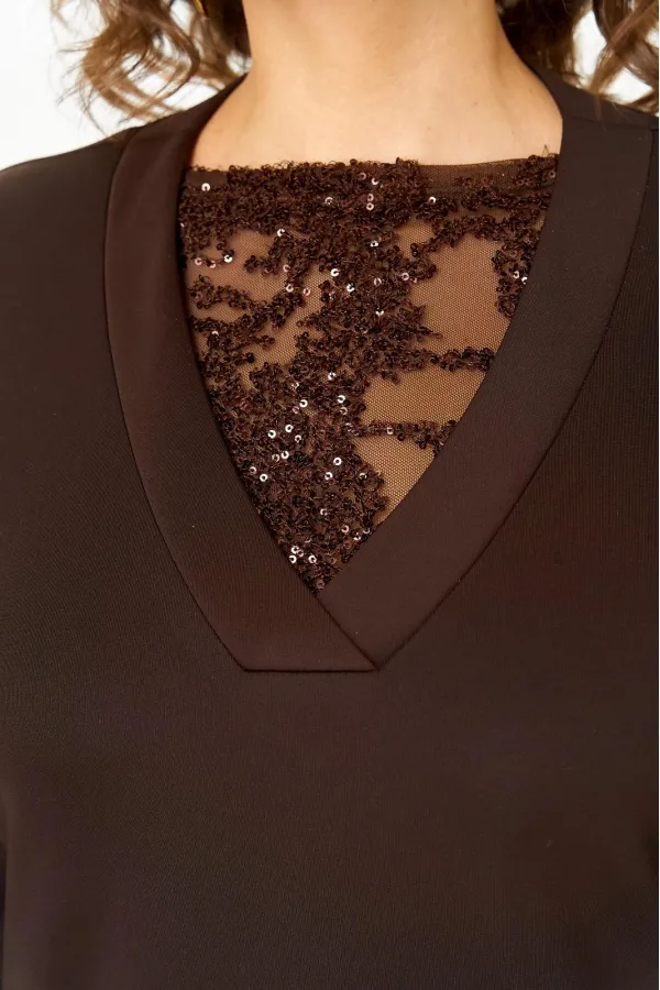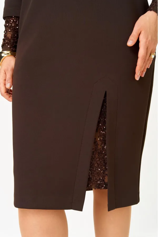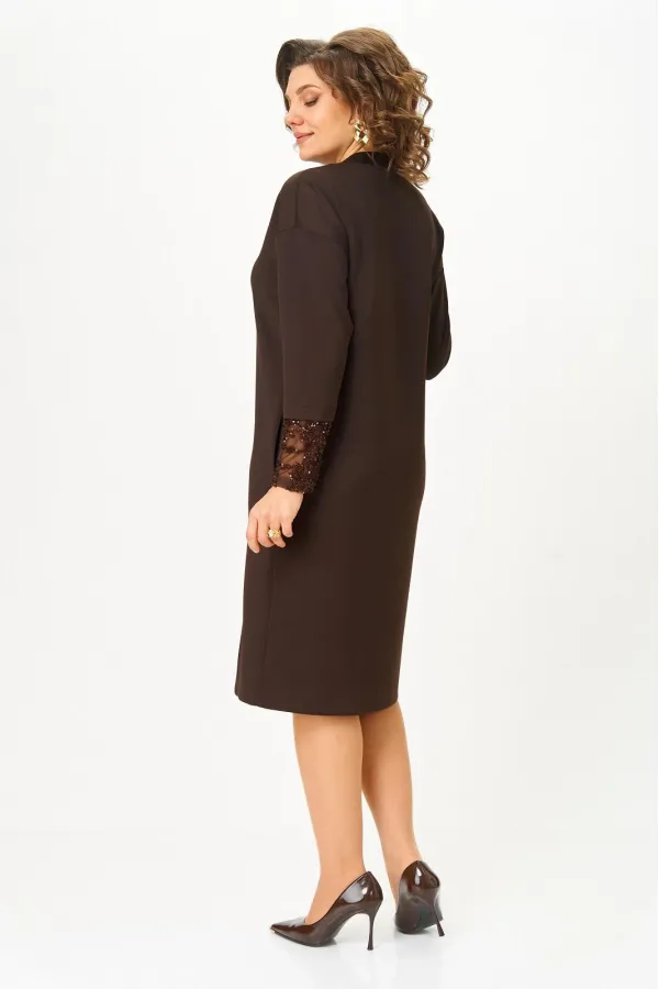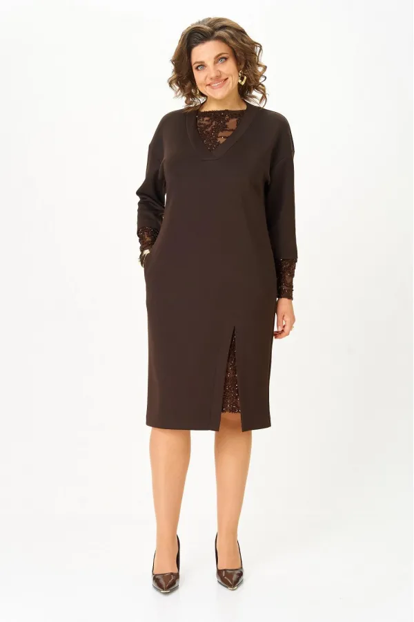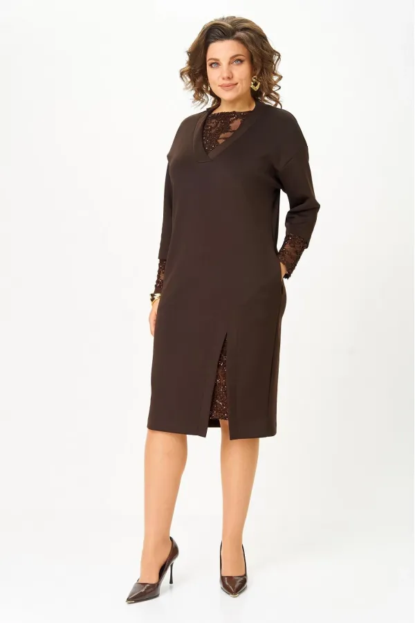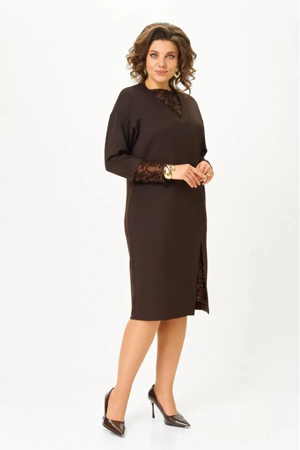 Нарядное женское платье из трикотажного полотна с добавлением хлопка и отделкой из трикотажной сетки с паетками. Силуэт прямой, слегка зауженный к низу, свободного облегания, длиной чуть ниже колена, вырез горловины У-образный с планкой и вставкой из сетки с паетками, линия плеча опущена, рукав длинный, по низу рукава вставка из аналогичной отделочной ткани, внизу по переду ассиметричная декоративная вставка также из сетки с паетками.