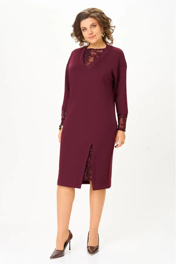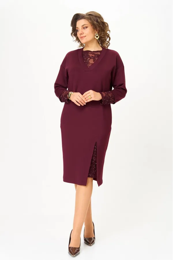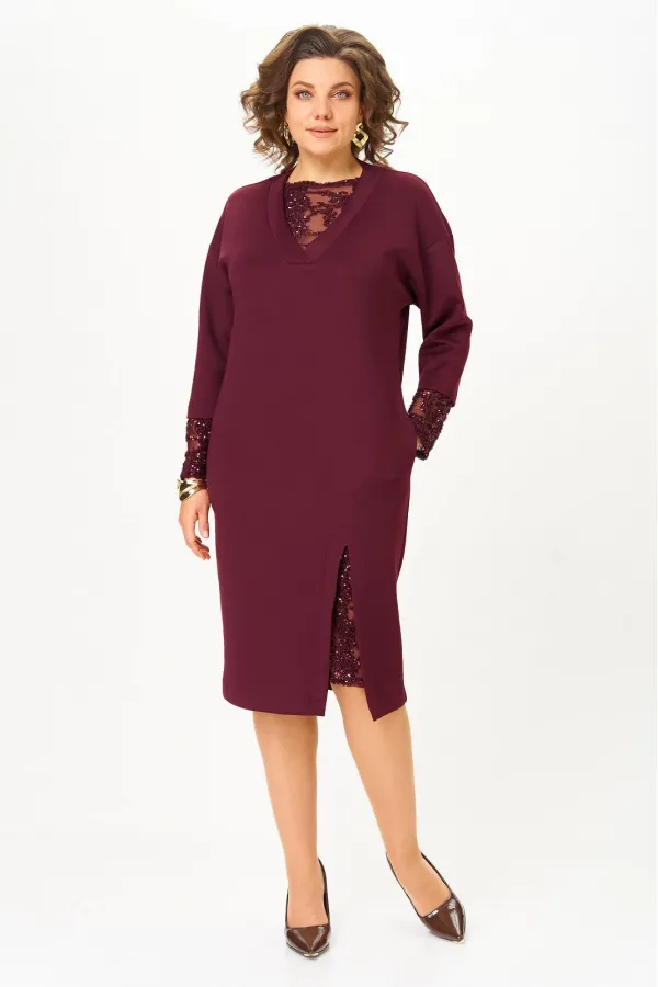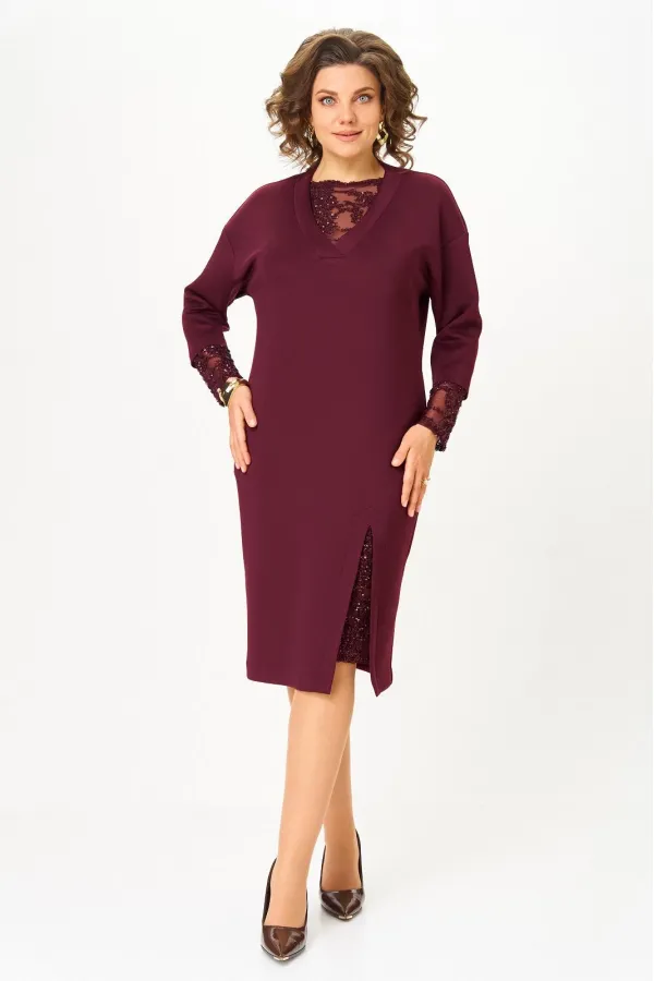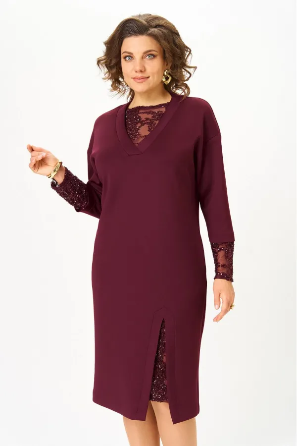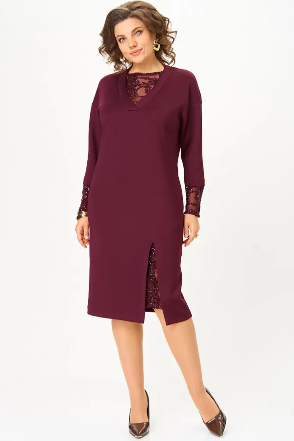 Нарядное женское платье из трикотажного полотна с добавлением хлопка и отделкой из трикотажной сетки с паетками. Силуэт прямой, слегка зауженный к низу, свободного облегания, длиной чуть ниже колена, вырез горловины У-образный с планкой и вставкой из сетки с паетками, линия плеча опущена, рукав длинный, по низу рукава вставка из аналогичной отделочной ткани, внизу по переду ассиметричная декоративная вставка также из сетки с паетками.