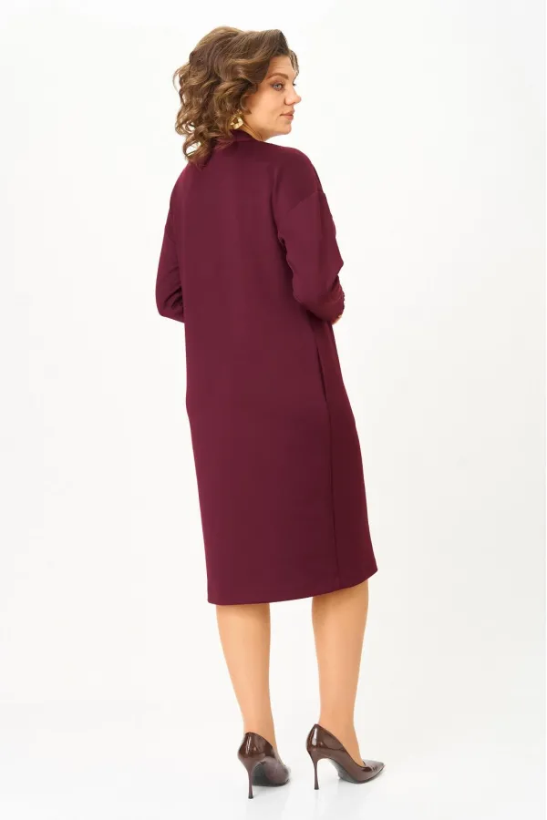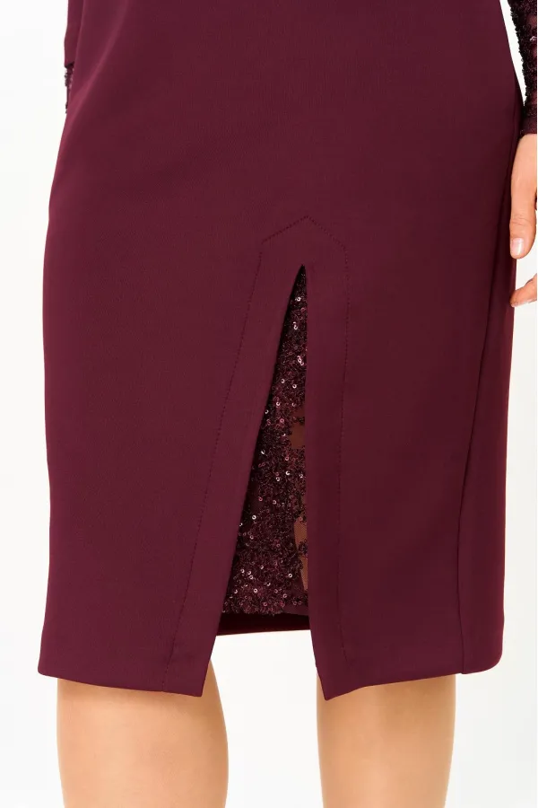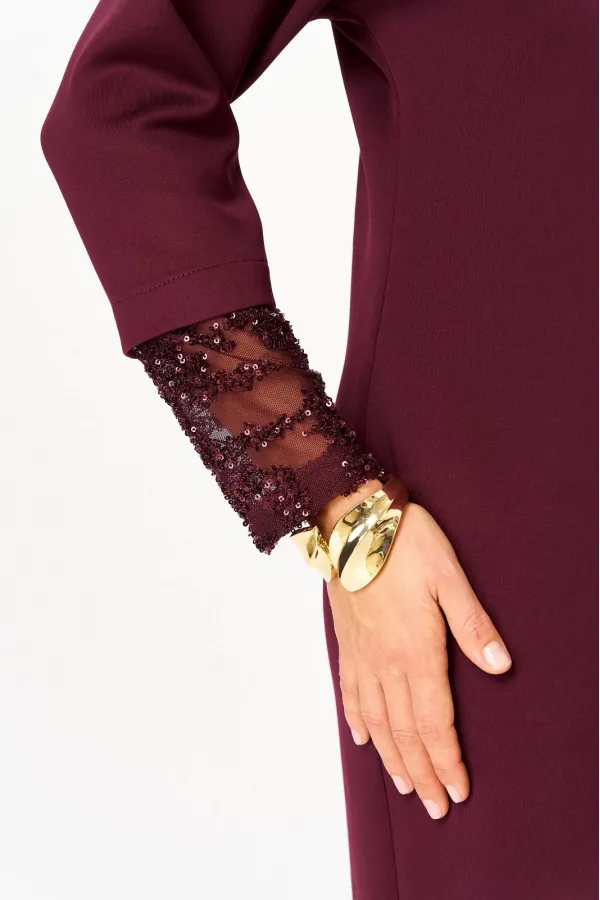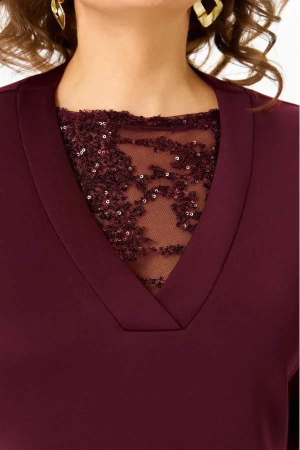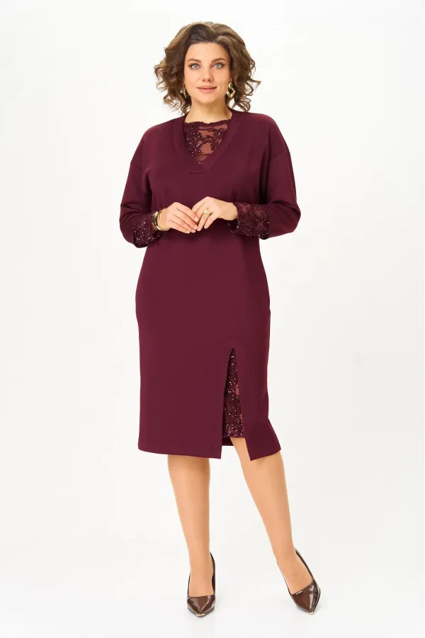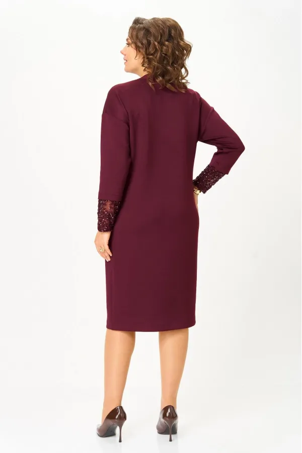 Нарядное женское платье из трикотажного полотна с добавлением хлопка и отделкой из трикотажной сетки с паетками. Силуэт прямой, слегка зауженный к низу, свободного облегания, длиной чуть ниже колена, вырез горловины У-образный с планкой и вставкой из сетки с паетками, линия плеча опущена, рукав длинный, по низу рукава вставка из аналогичной отделочной ткани, внизу по переду ассиметричная декоративная вставка также из сетки с паетками.