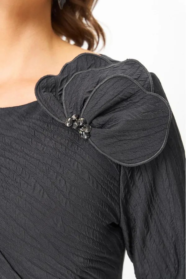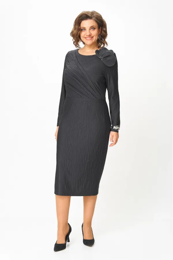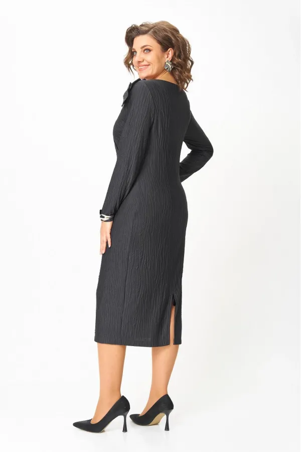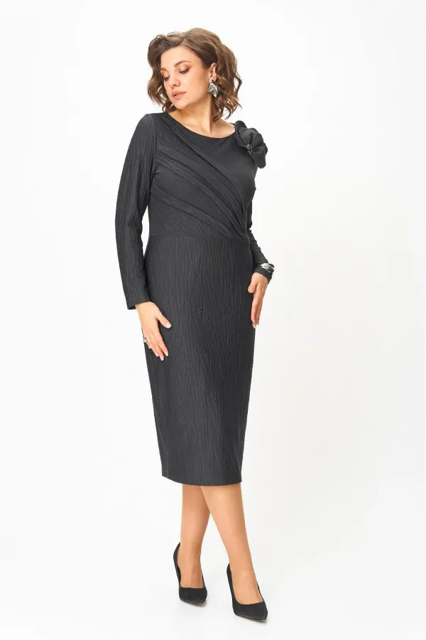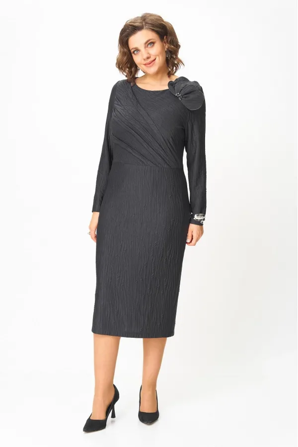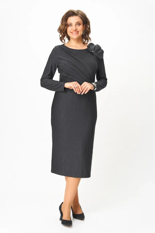 Нарядное женское платье из трикотажного полотна с добавлением вискозы, с оригинальной выпуклой фактурой с рисунком в тон. Силуэт полуприлегающий, по переду отрезное по линии талии, по лифу наклонные бантовые складки, вырез горловины круглый, рукав длинный, по спинке в среднем шве разрез. Съемный цветок украшен декоративными пуговицами-стразами.