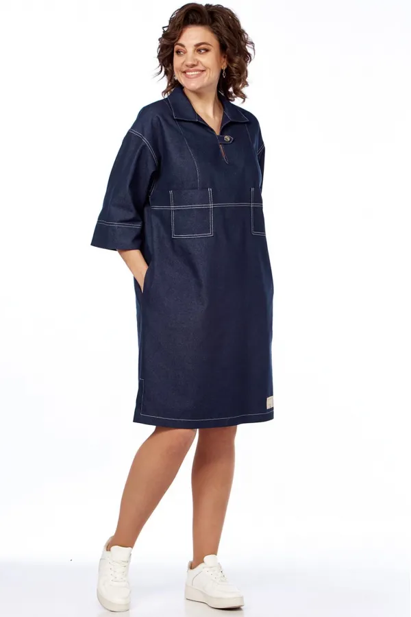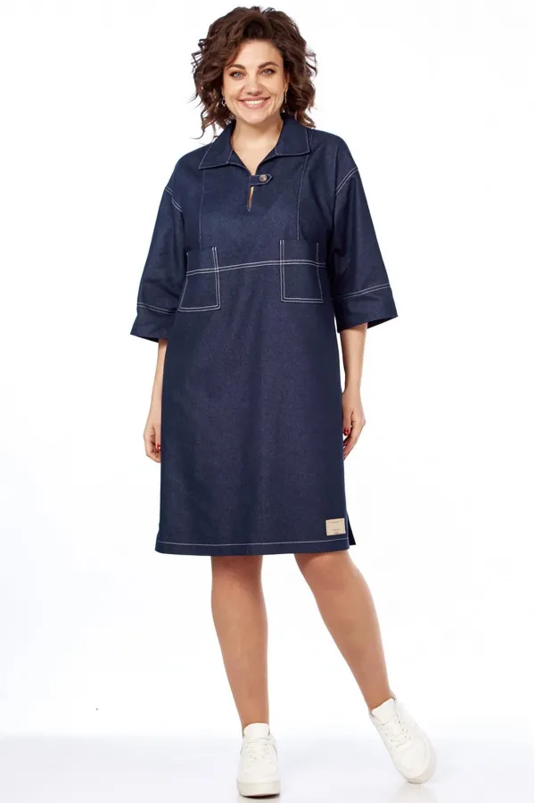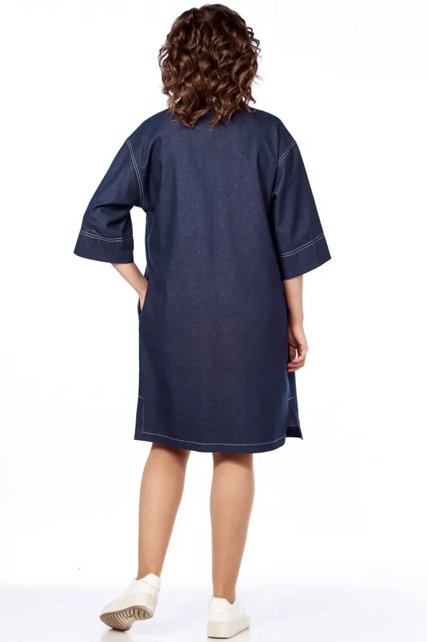 Платье женское, прямого силуэта, из джинсовой ткани. Платье с круглым вырезом горловины, обработанным воротником, со спущенной линией плеча. Перед платья отрезной по линии талии, рельефами и накладными карманами. Спинка цельная. Рукава втачные, одношовные, длиной 3/4. В боковых швах обработаны карманы.