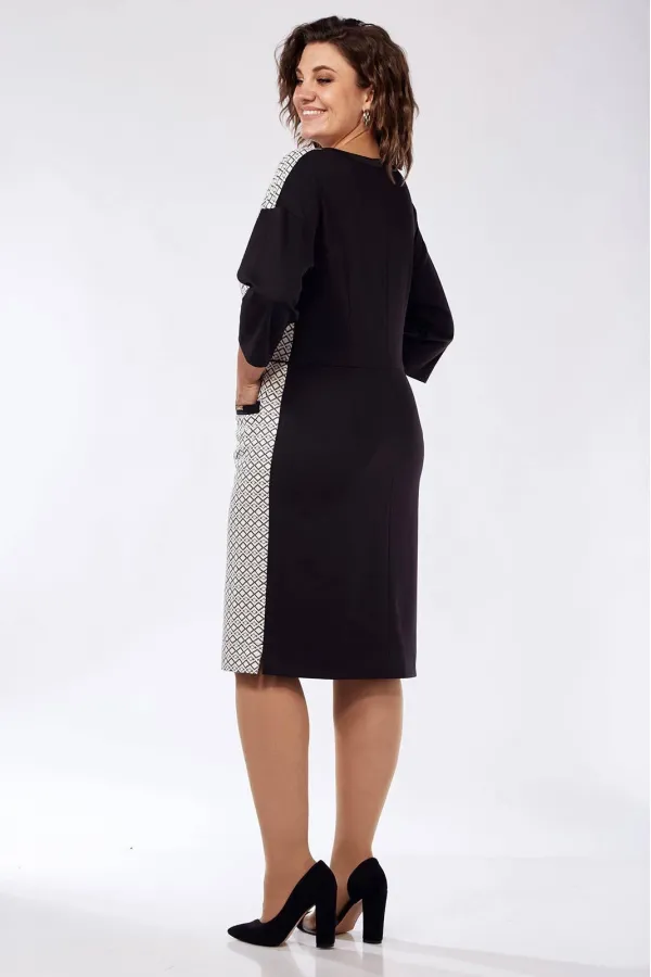 Платье женское полуприлегающего силуэта, из трикотажного полотна. С фигурным вырезом горловины, обработанным отделочными деталями, с украшением. Отрезное по талии, с кантом, с талиевыми вытачками. Со средним швом, с кантом. Юбка переда с карманами с листочкой. Спинка со средним швом и талиевыми вытачками. Со спущенной линией плеча, одношовными рукавами, длиной 3/4. Небольшие разрезы в боковых швах. Деталь переда из отделочного материала. Размеры 44-48: длина платья 100 см, длина рукава 33 см. Раззмеры 50-54: длина платья 102 см, длина рукава 35 см.