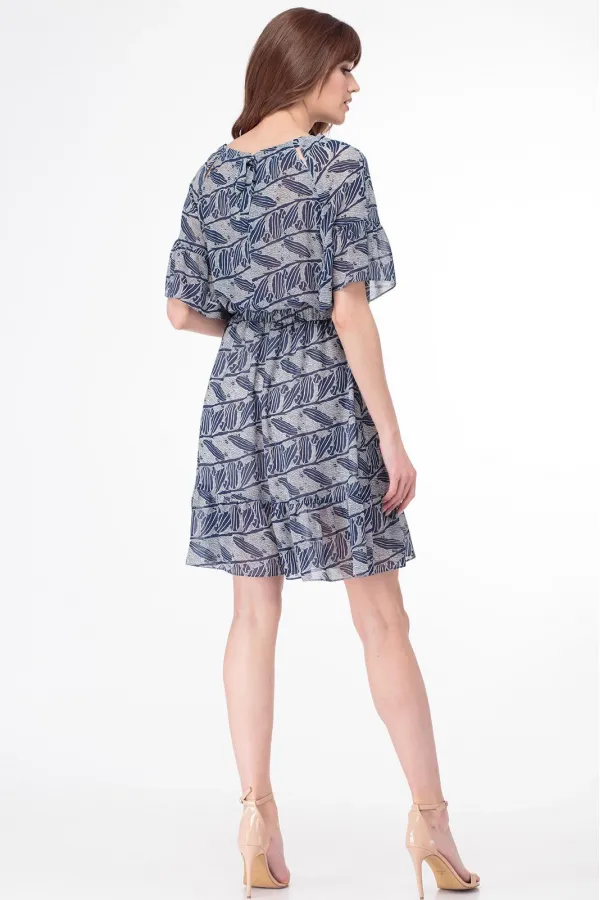 Лучшим выбором для летнего сезона станут легкие платья из струящихся тканей, они востребованы среди многих девушек и женщин, и является прекрасным выбором для жаркого лета. Платье полуприлегающего силуэта с расклешенной юбкой с эффектом запаха, нижняя часть на подкладке. Вырез горловины округлый с завязкой сзади. Спинка со средним швом. Линия талии присборено эластичной тесьмой. Рукав реглан с притачным присборенным воланом. По линии реглана небольшие разрезы сзади и спереди. Низ платья декорирован воланами.