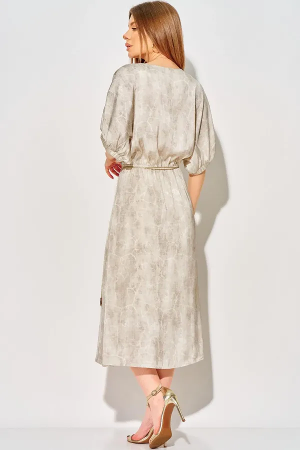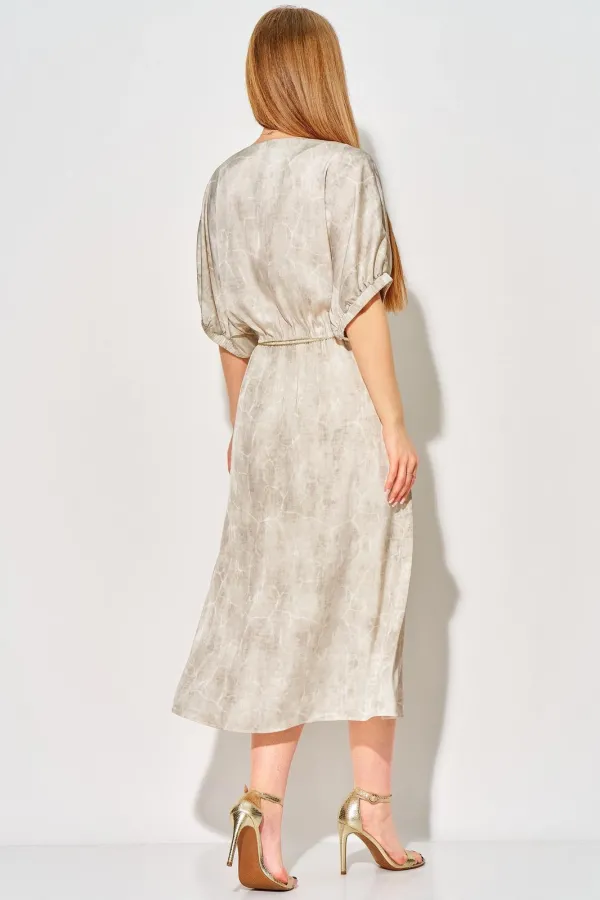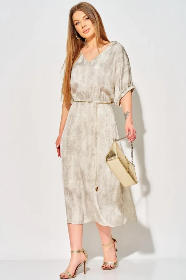 Длина платья до середины икр, отрезное на уровне линии талии, к низу расширенное. Вырез горловины платья «V-образной» формы, обработан обтачкой. Лиф детали переда со средним швом. Юбка платья на тонкой трикотажной подкладке. В шов соединения лифа и юбки вставлена эластичная тесьма. Рукава цельнокроеные, с ластовицей, и с притачной планкой, собраны на эластичную тесьму.
