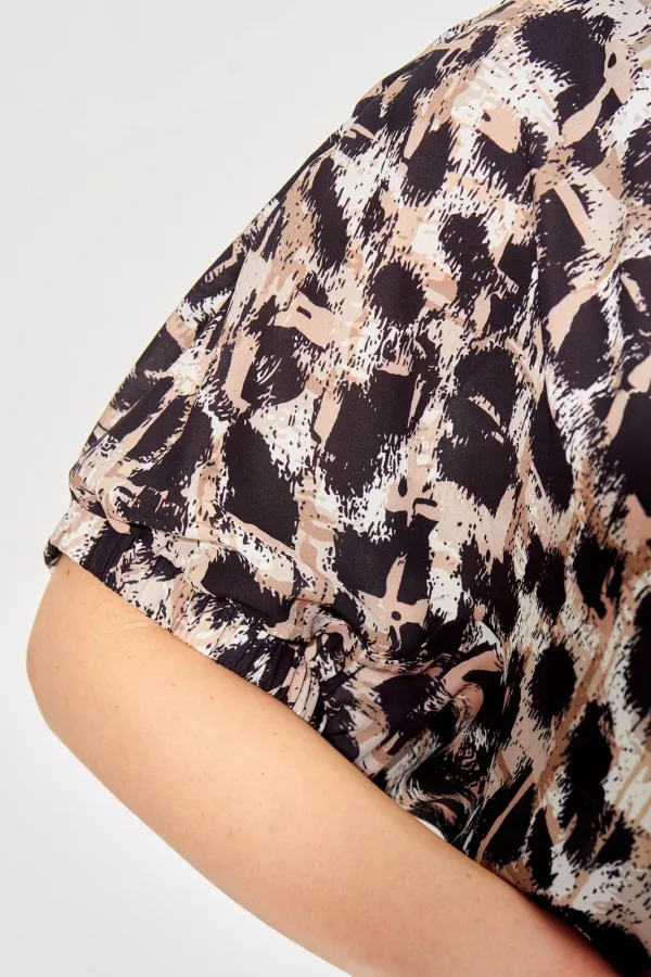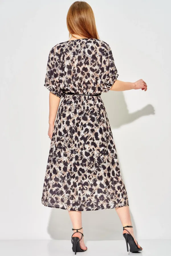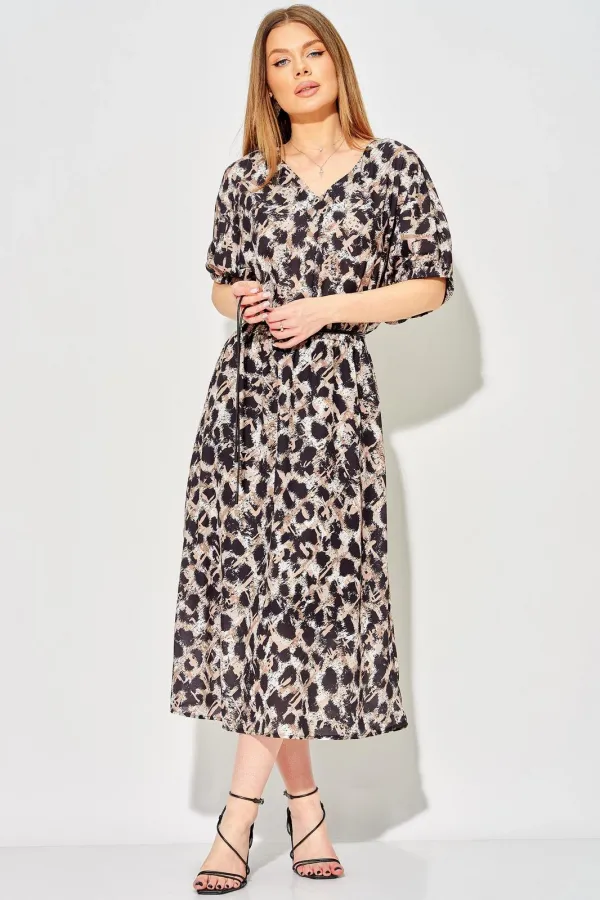 Длина платья до середины икр, отрезное на уровне линии талии, к низу расширенное. Вырез горловины платья «V-образной» формы, обработан обтачкой. Лиф детали переда со средним швом. Юбка платья на тонкой трикотажной подкладке. В шов соединения лифа и юбки вставлена эластичная тесьма. Рукава цельнокроеные, с ластовицей, и с притачной планкой, собраны на эластичную тесьму.