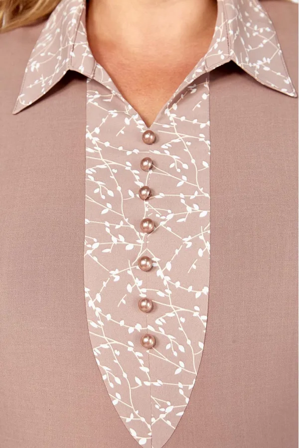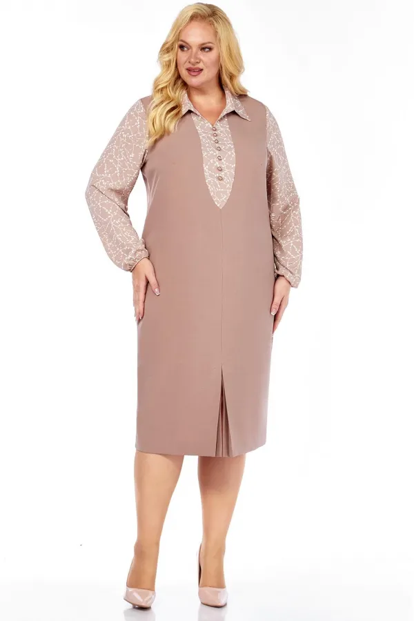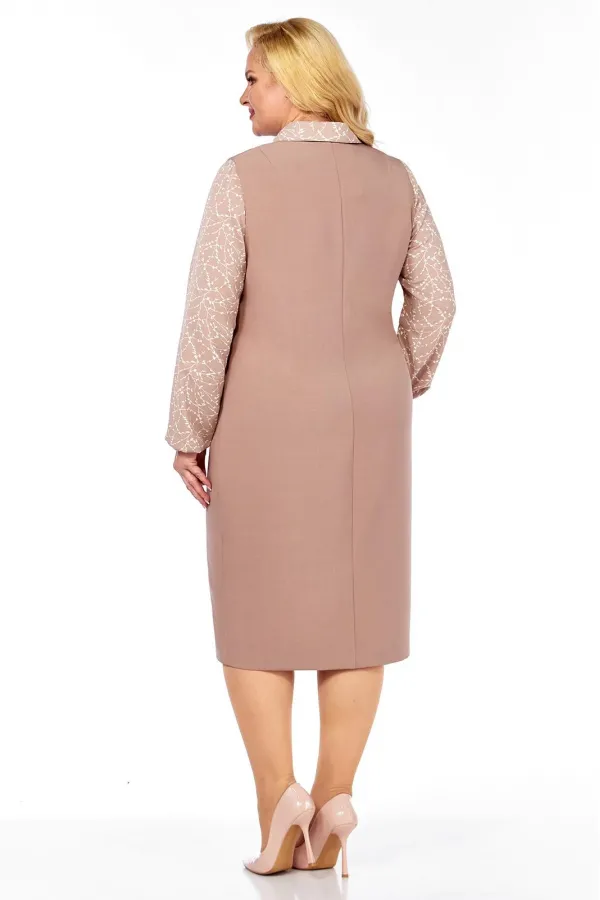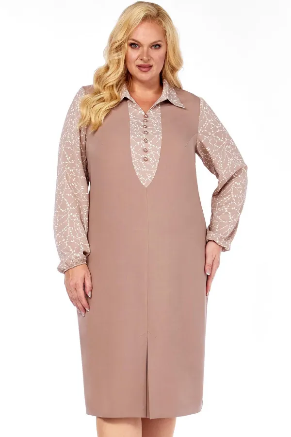 Текстильное платье полуприлегающего силуэта средней длины за колено на рост 164см. Платье имитирует комплект, состоящий из сарафана и блузки. Воротник рубашечный на отрезной стойке. Рукав втачной длинный внизу на эластичной тесьме. Перед платья с нагрудными вытачками и средним швом, в котором обработана встречная шлица с разрезом. Спинка со средним швом и плечевыми вытачками.