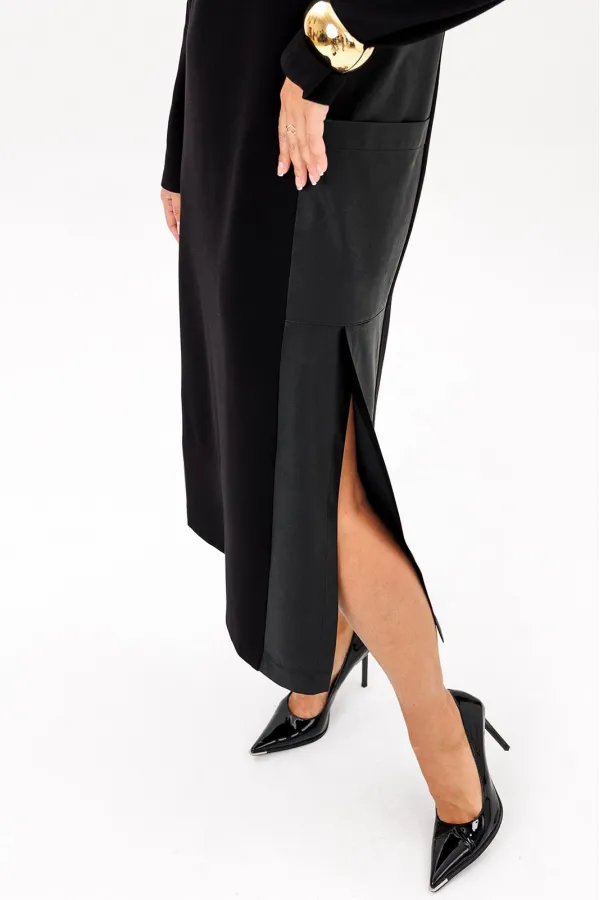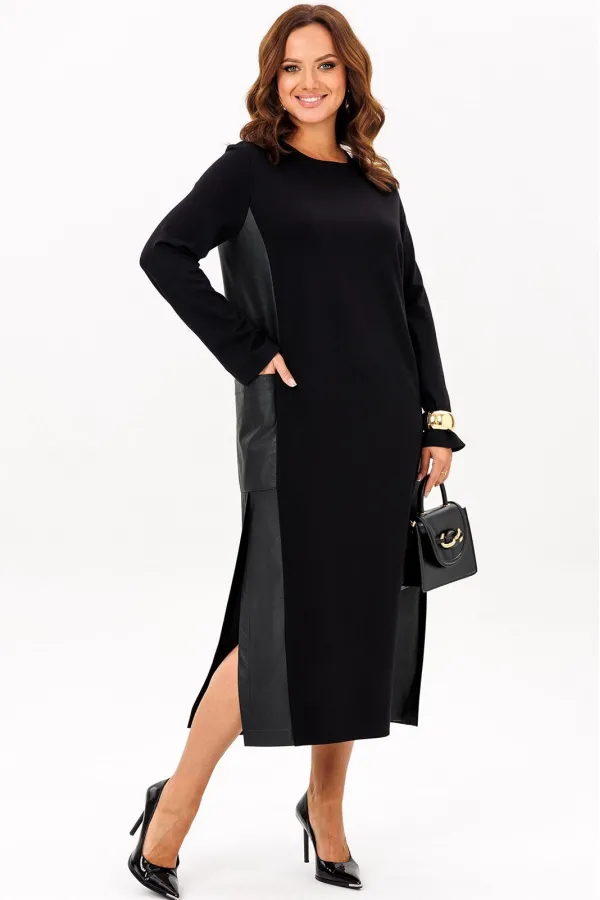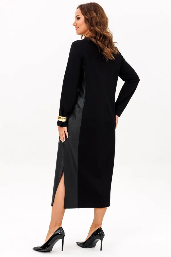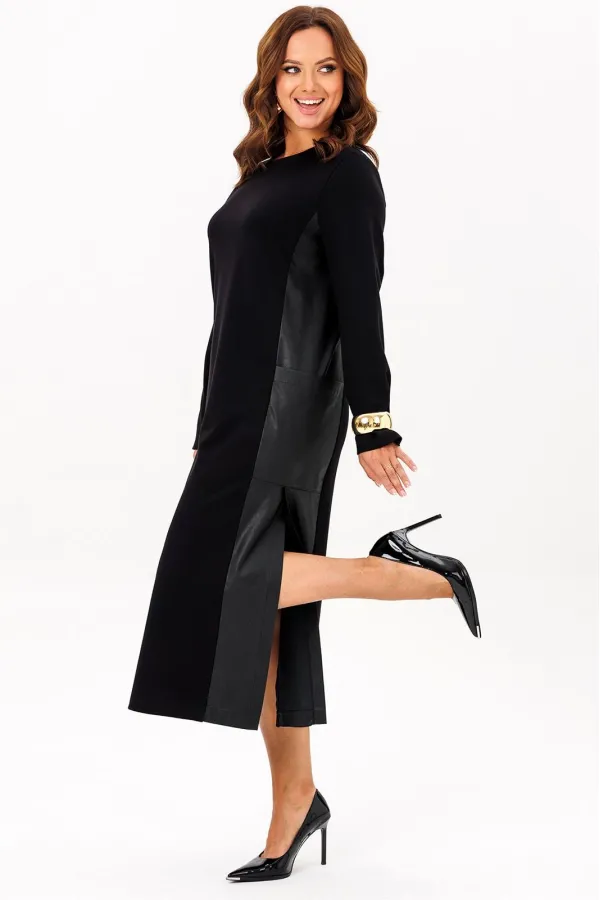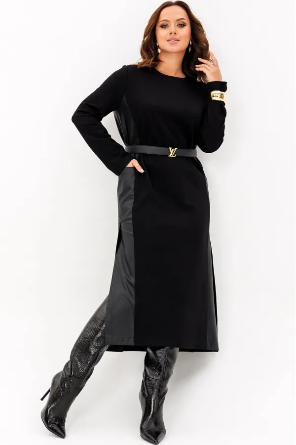 Платье выполнено из двух видов ткани: трикотажного полотна и эко кожи. Платье