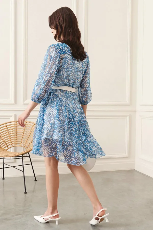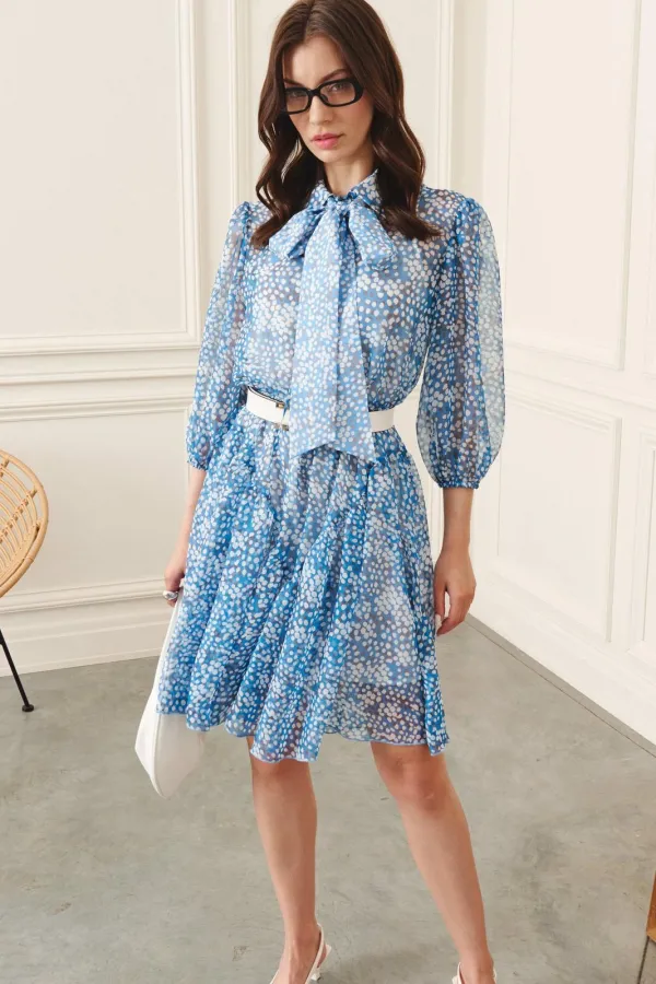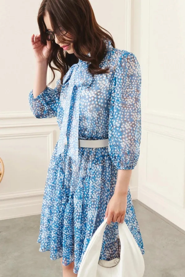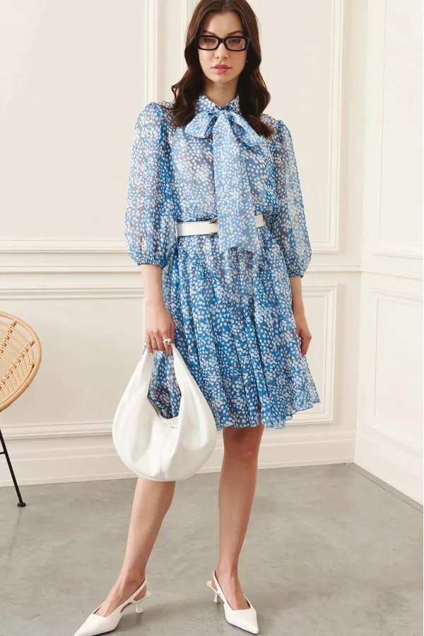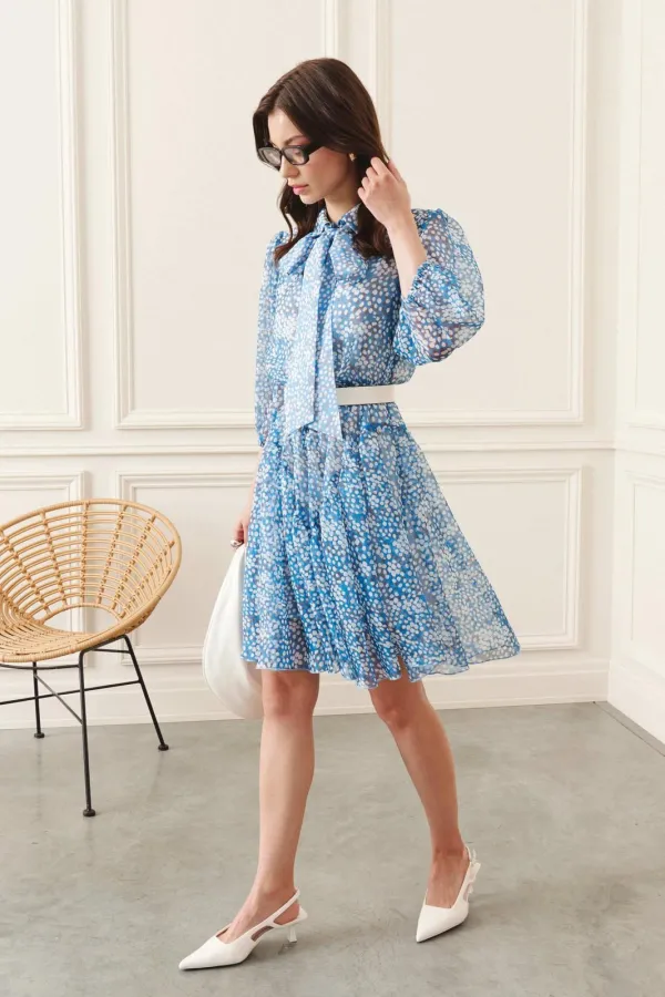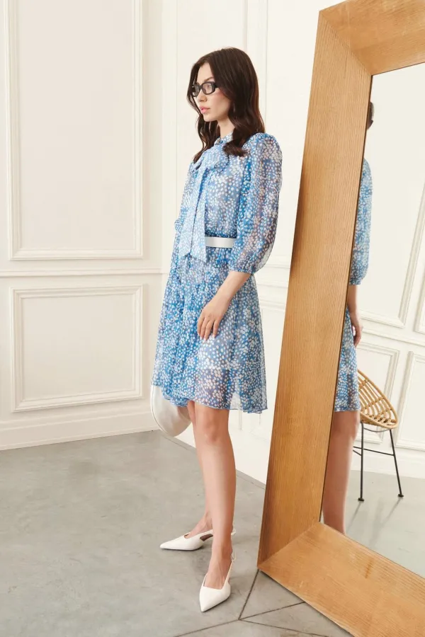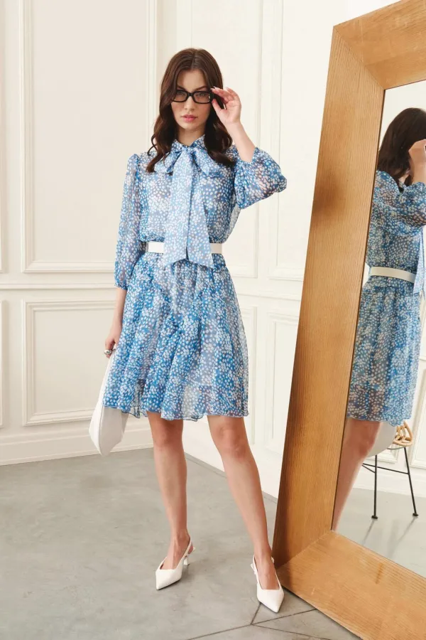 Платье свободного кроя из шифоновой ткани. Рукав втачной, до линии локтя по верхней части рукава сборка, по низу рукава резинка. По горловине воротник рубашечного типа на завязку и фигурный вырез в форме капли. Платье по линии талии отрезное, на резинке. По юбке платья притачной волан на сборку. В комплектацию входит пояс из экокожи и съёмный бант, который также можно завязать на талии как пояс.Верхнее платье: