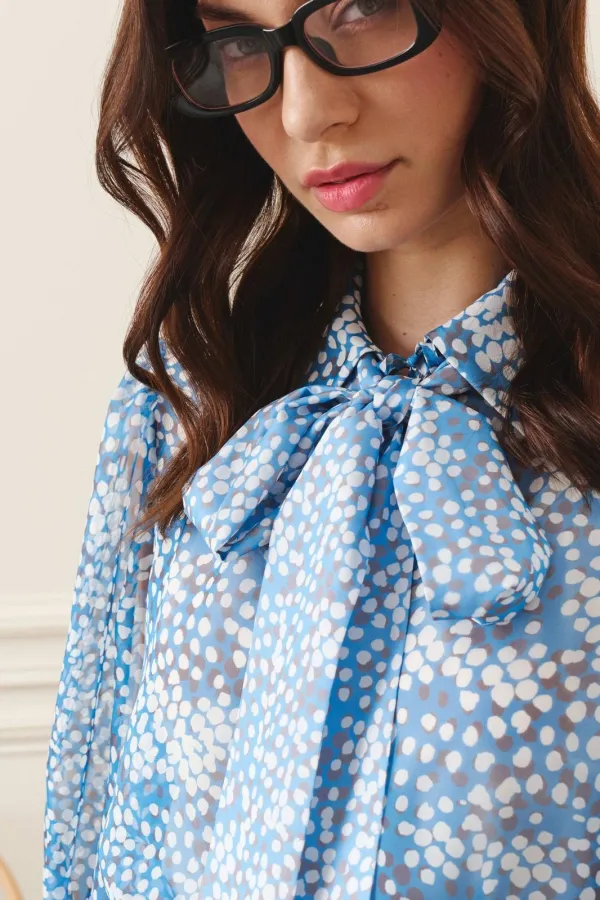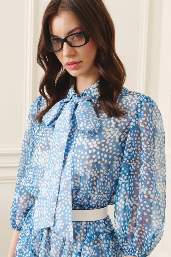 Платье свободного кроя из шифоновой ткани. Рукав втачной, до линии локтя по верхней части рукава сборка, по низу рукава резинка. По горловине воротник рубашечного типа на завязку и фигурный вырез в форме капли. Платье по... Читать далее...