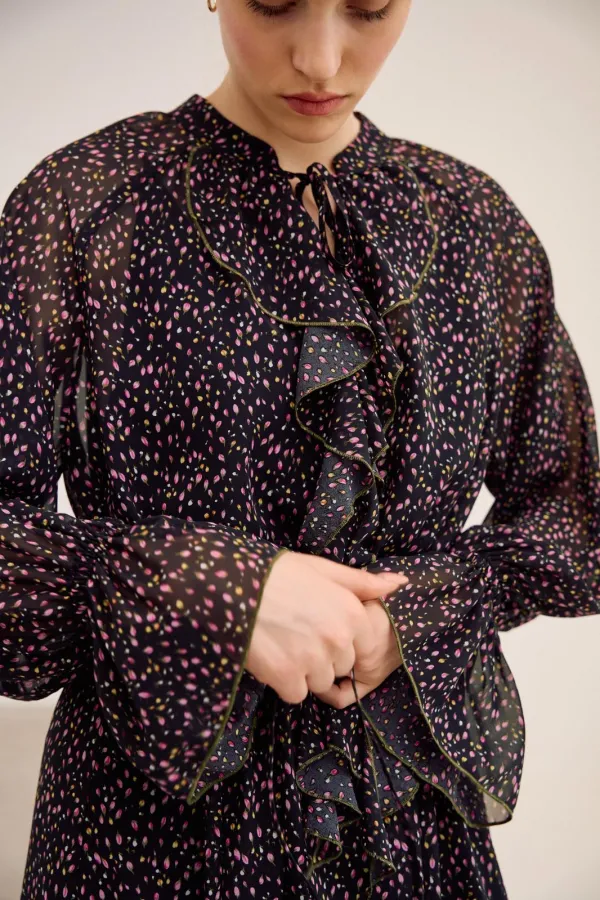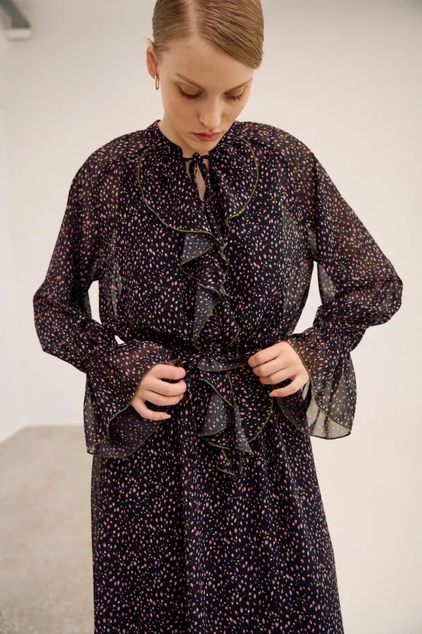 Платье свободного кроя, выполнено из шифона, дизайн горох. Рукав длинный реглан, по низу рукава резинка. Глубокий V-образный вырез горловины, в который вставлена рюша, по горловине стойка на завязку, по середине выреза з... Читать далее...