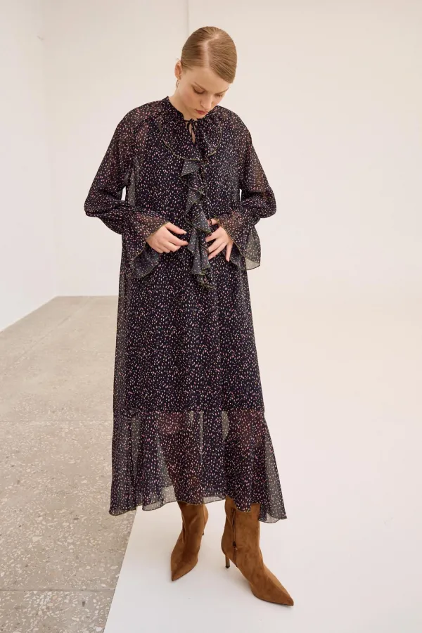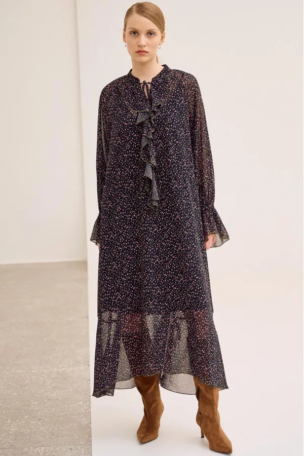 Платье свободного кроя, выполнено из шифона, дизайн горох. Рукав длинный реглан, по низу рукава резинка. Глубокий V-образный вырез горловины, в который вставлена рюша, по горловине стойка на завязку, по середине выреза застежка на навесной потайной крючок. По линии талии по переду и спинке кулиса на завязку, по низу платья притачной волан. В комплект входит платье-комбинация из трикотажной подкладки на бретелях.Платье: