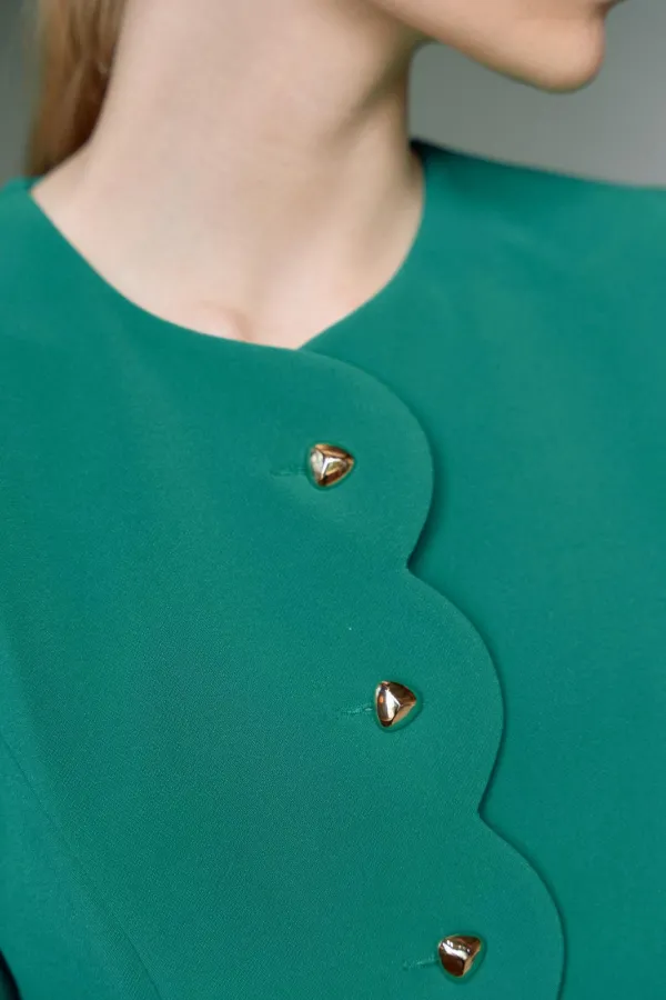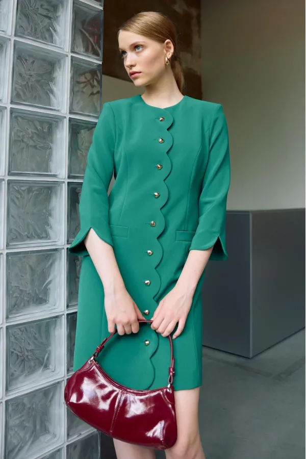 Платье полуприлегающего силуэта, по переду и спинке на подкладке. Рукав втачной ¾, по низу фигурный. Округлый вырез горловины, застежка центральная на петли и пуговицы, борт фигурной формы. По вертикальный рельефы и прорезные карманы. По спинке средний шов и вертикальные рельефы.Платье:
