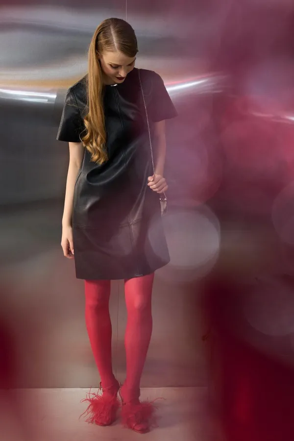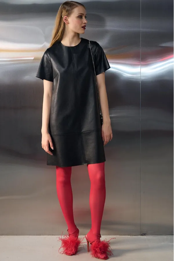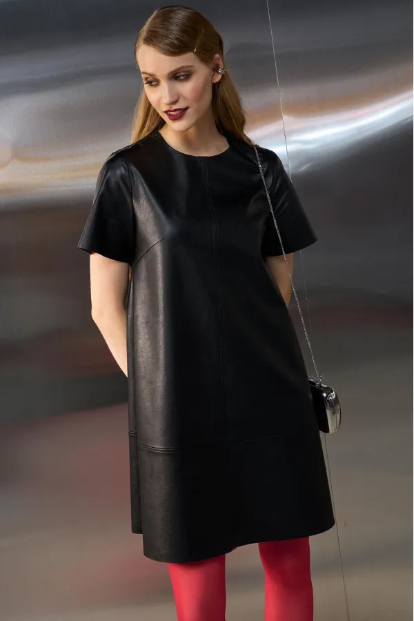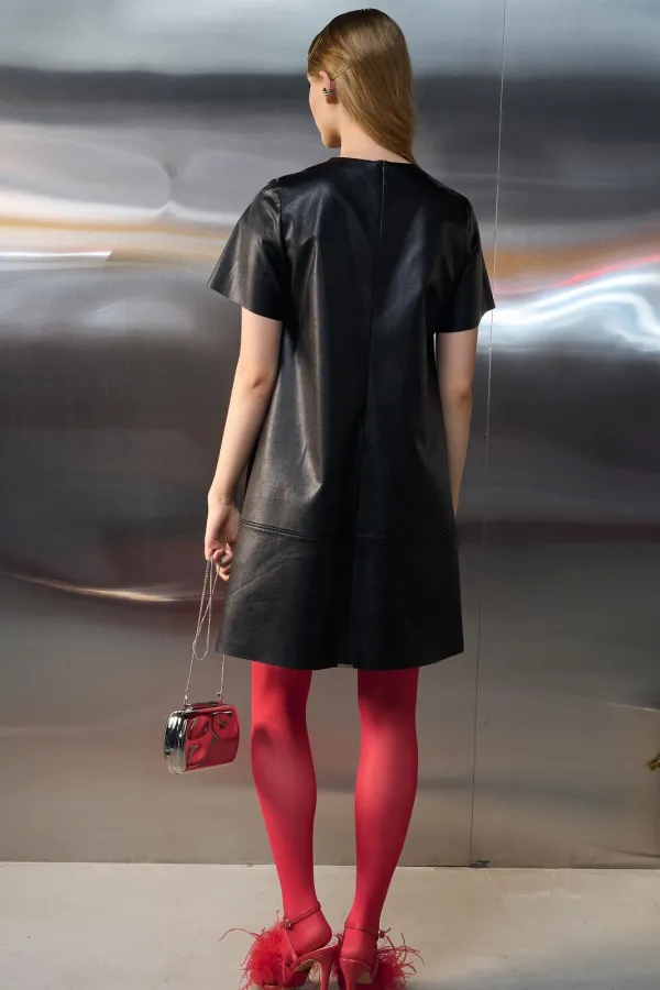 Платье А силуэта выполнено из экокожи, на подкладке. Рукав втачной короткий, округлый вырез горловины. По переду центральный шов и нагрудные вытачки. Застежка на потайную молнию в среднем шве спинки. Центральные, боковые швы и горловина декорированы металлическими зажимами.Длина по спинке от высшей точки горловины: 90 см