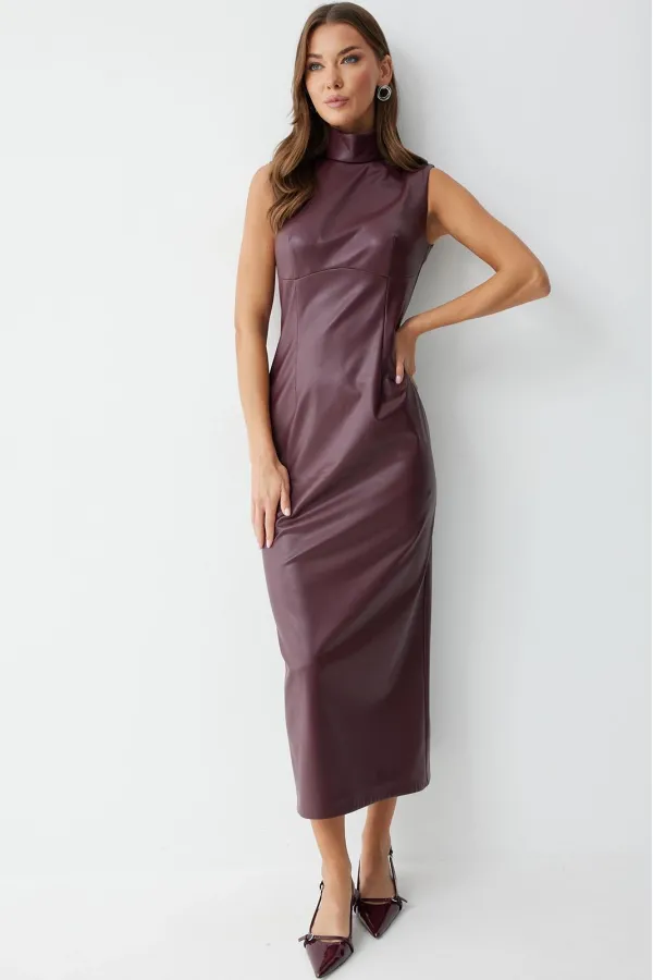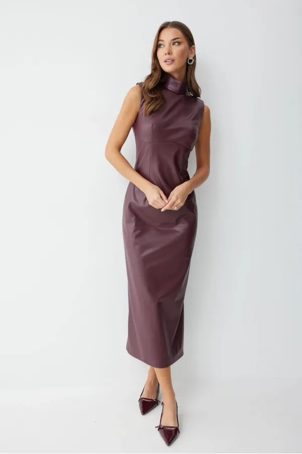 Платье прилегающего силуэта из экокожи длиной миди. Горловина-стойка. Спереди под грудью подрез, нагрудные и талиевые вытачки. На спинке в центральном шве потайная молния, по низу шлица. На спинке платья талиевые вытачки.