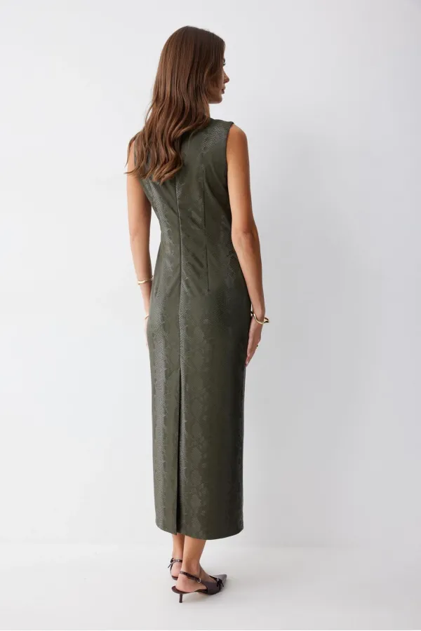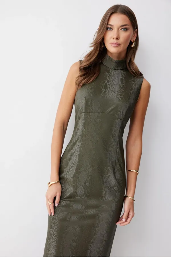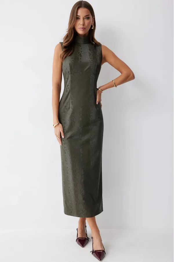 Платье прилегающего силуэта из экокожи длиной миди. Горловина-стойка. Спереди под грудью подрез, нагрудные и талиевые вытачки. На спинке в центральном шве потайная молния, по низу шлица. На спинке платья талиевые вытачки.