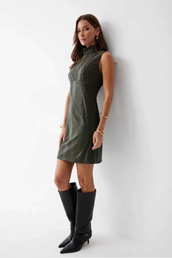 Платье прилегающего силуэта слегка расширенное книзу из экокожи длиной мини. Горловина-стойка. Спереди под грудью подрез, нагрудные и талиевые вытачки. На спинке в центральном шве потайная молния. На спинке платья талиевые вытачки. Обращаем ваше внимание, что фурнитура может отличаться от фото.