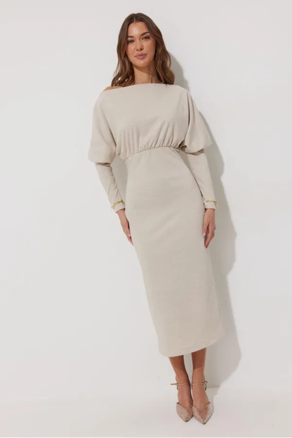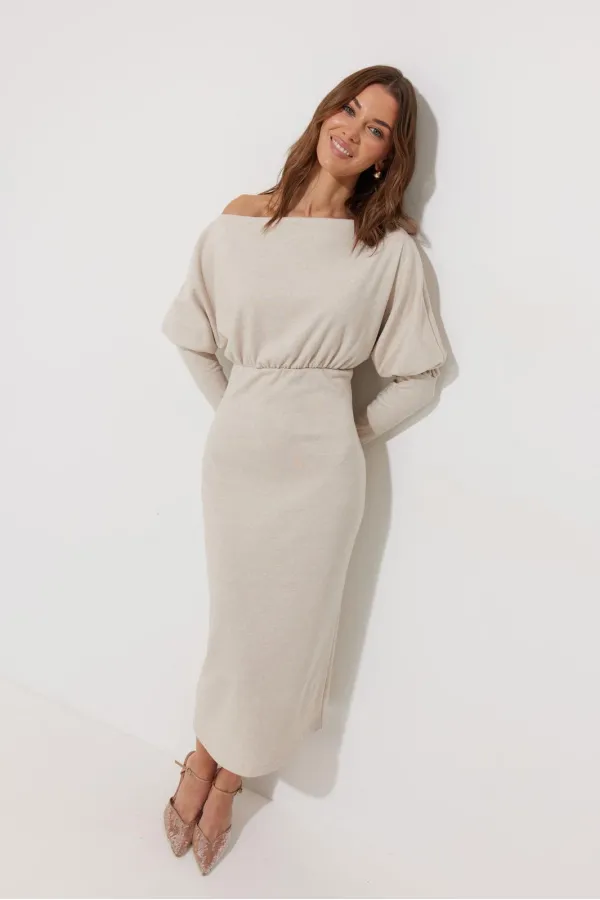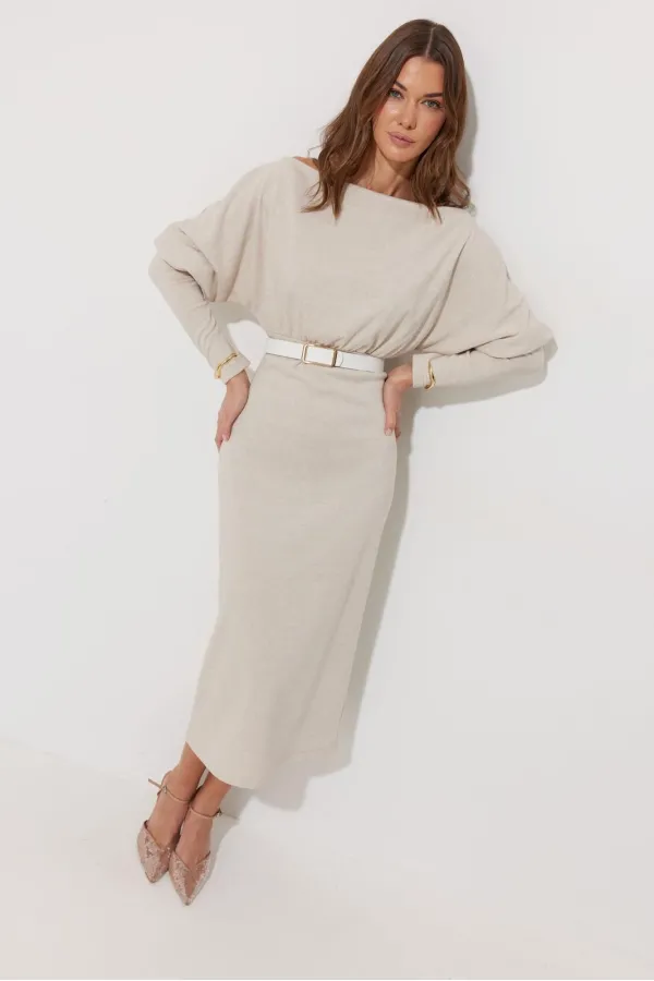 Платье полуприлегающего силуэта из трикотажного полотна. Горловина-лодочка. Рукав цельнокроеный, с подрезом выше уровня локтя и узкой длинной манжетой. По переду и спинке выше линии талии подрез, в который вставлена резинка. Обращаем ваше внимание, что ремень в комплект не входит.