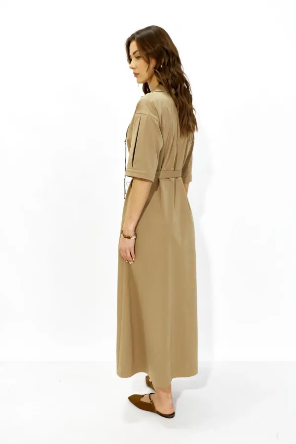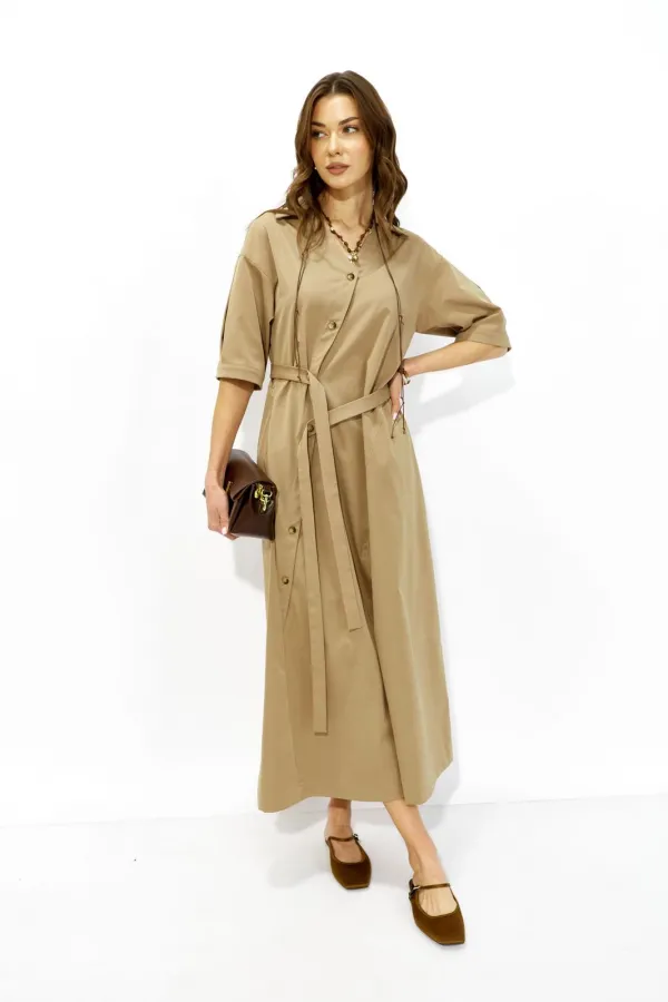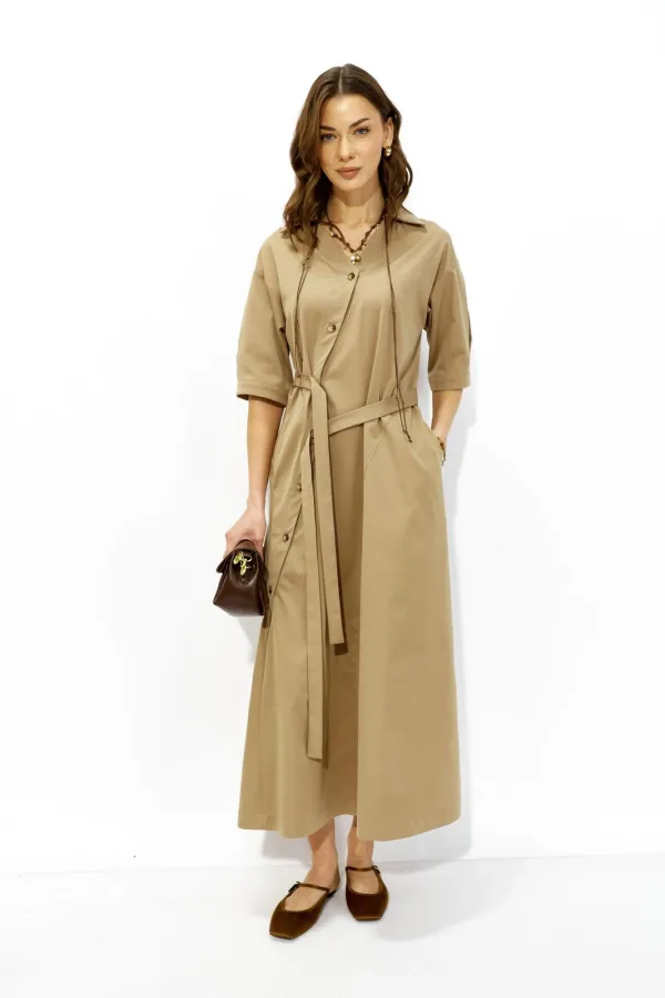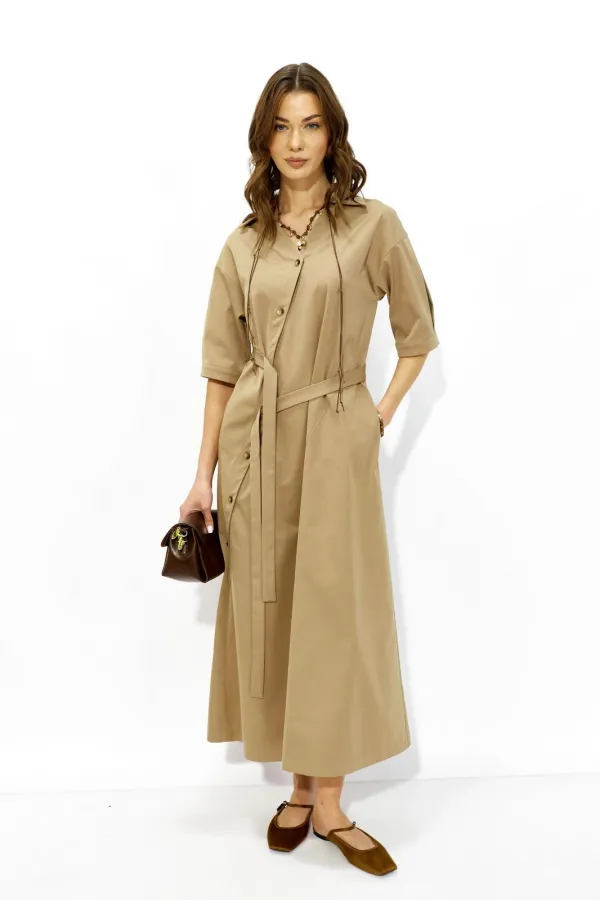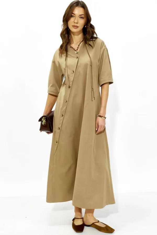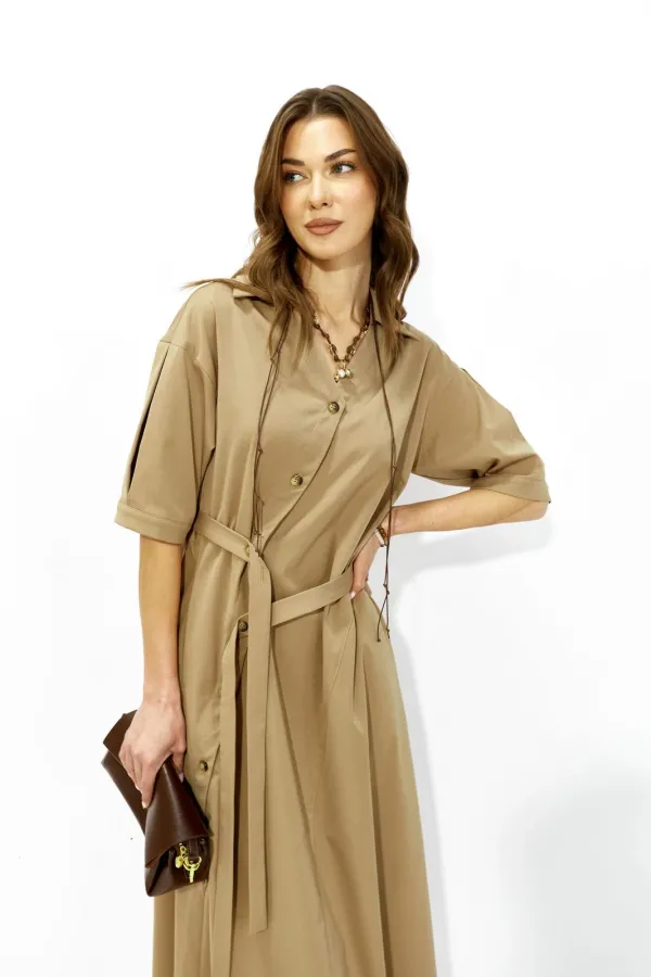 Стильное платье А-силуэта, расширенное к низу из плательной ткани. Застежка смещенная на отрезную планку с пуговицами в натуральном стиле. По переду фигурный ассиметричный подрез. Спинка по линии талии отрезная. Линия плеч спущена, рукава со встречными складками по центру и притачными манжетами по низу. Платье дополняет пояс, застегивающийся на пуговицы планки. При желании пояс можно завязать или носить платье самостоятельно без пояса. Обращаем ваше внимание, что фурнитура может отличаться от фото.