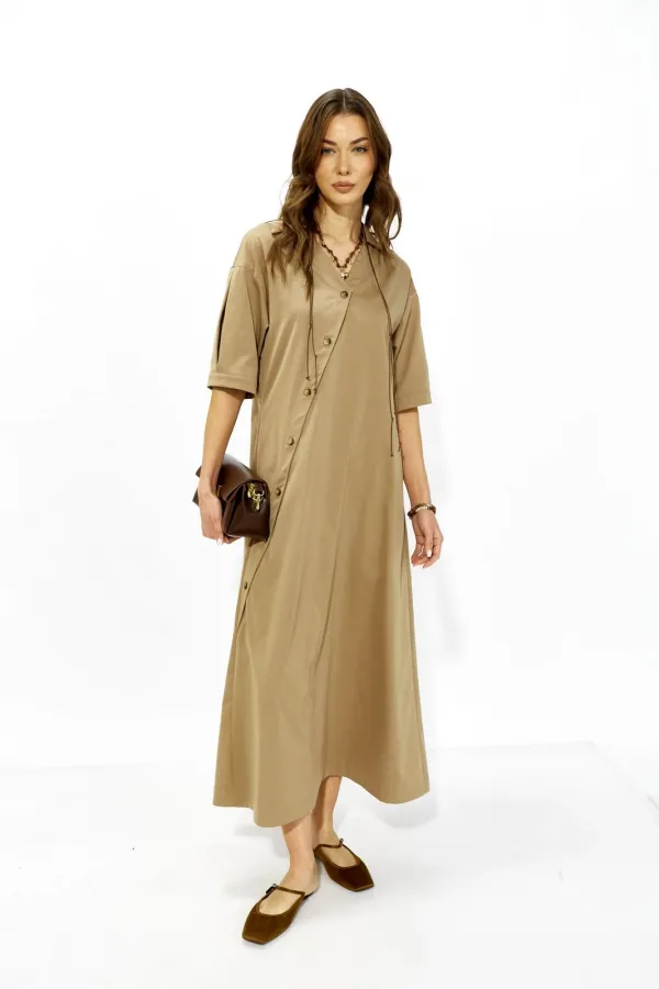 Стильное платье А-силуэта, расширенное к низу из плательной ткани. Застежка смещенная на отрезную планку с пуговицами в натуральном стиле. По переду фигурный ассиметричный подрез. Спинка по линии талии отрезная. Линия п... Читать далее...
