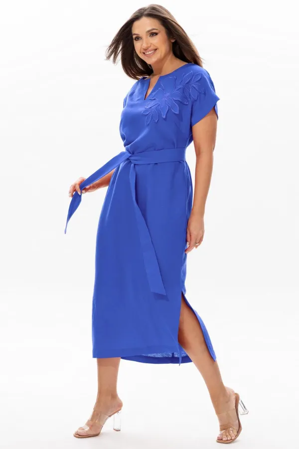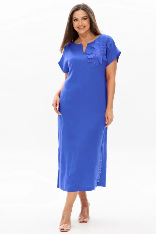 Льняное длинное платье Ma Сhérie свободного силуэта. Вырезгорловины фигурный, на полочке расположена дизайнерская вышивка-апликация. Спинка с центральным швом, в боковых швах разрезы. Рукав короткий, линия плеча спущена.... Читать далее...