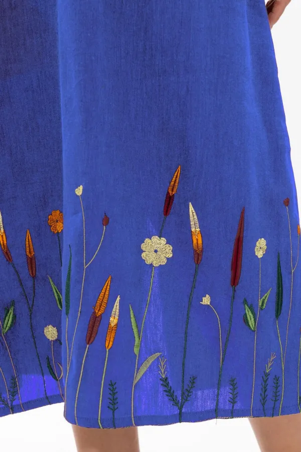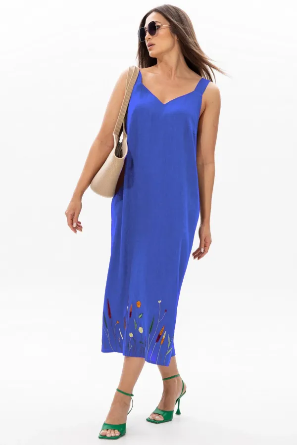 Льняной длинный сарафан Ma Сhérie А-образного силуэта. Перед сарафана с нагрудными вытачками, цельный. Снизу засположена дизайнерская вышивка. Спинка с центральным швом, снизу в котором выполнен разрез. Длина изделия 12... Читать далее...