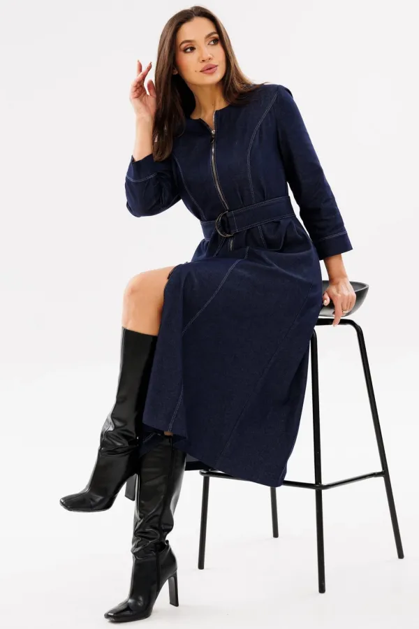 Модное джинсовое платье Ma Сhérie длиной миди. Перед с рельефным швом, выходящим из проймы. Горловина округлой формы, обработана обтачкой. Застежка центральная на молнию. Спинка с центральным швом и рельефным швом, вы... Читать далее...