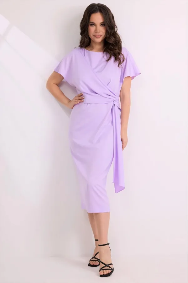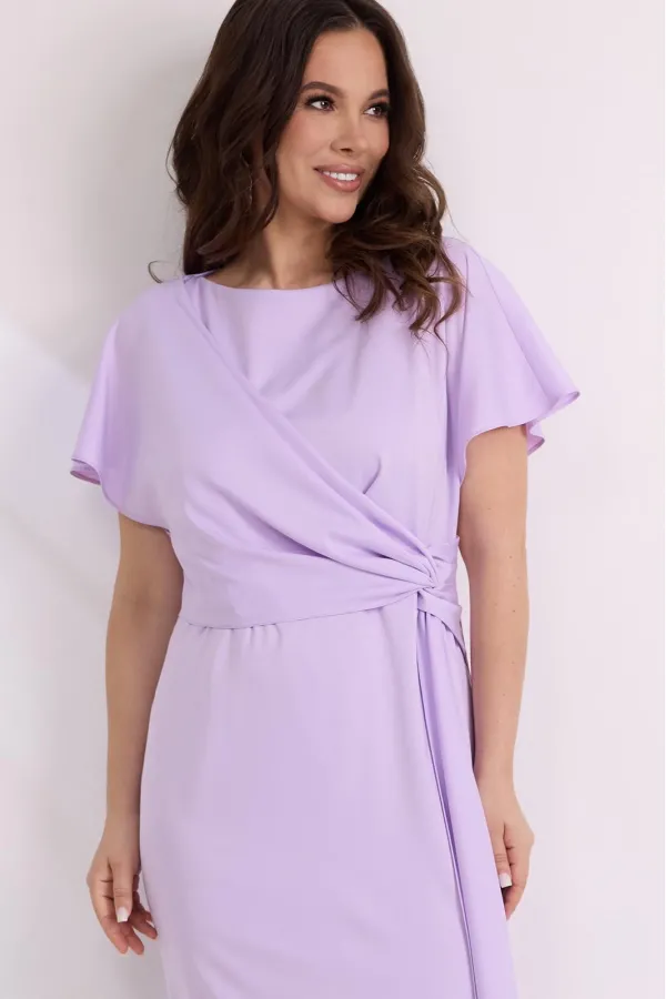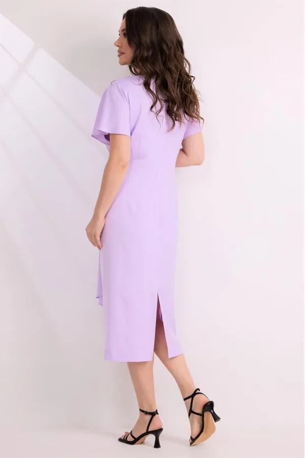 Нарядное элегантное платье приталенного силуэта с цельнокроеным коротким рукавом. Выполнено из шелковистой ткани средней плотности с атласным блеском. По спинке застёжка на потайную молнию, снизу разрез. Платье на тонкой трикотажной подкладке. Спереди по платью декоративная отлетная деталь, придающая платью неповторимый шарм и нарядность.