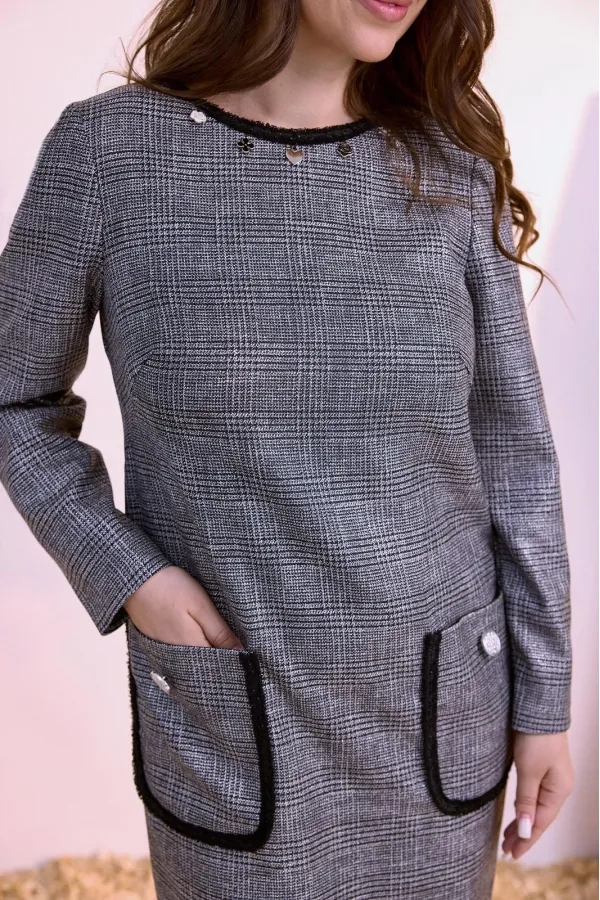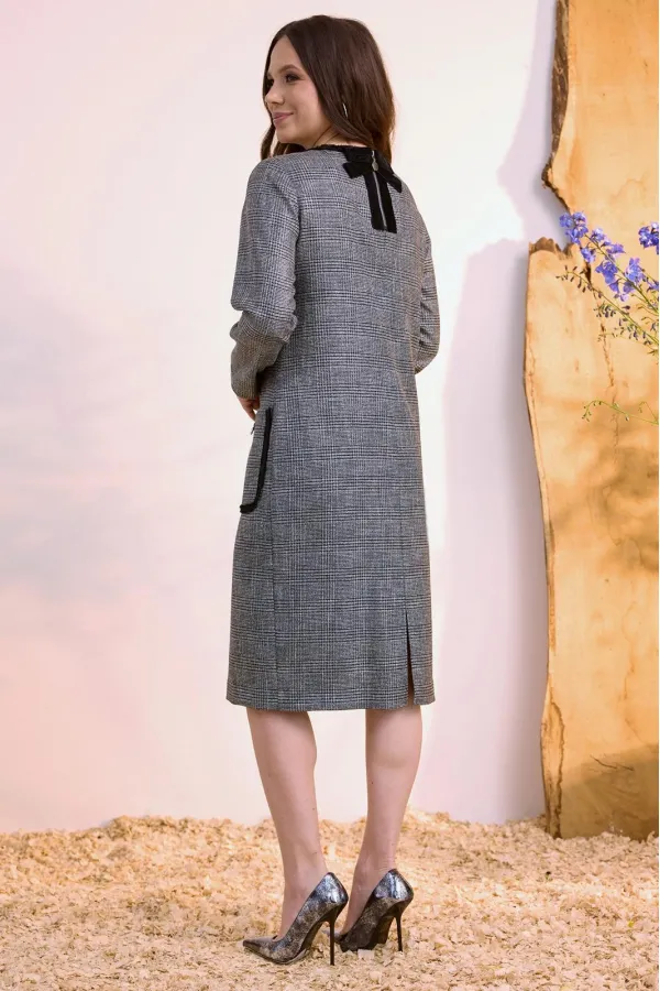 Элегантное платье полуприлегающего силуэта из комфортной костюмной ткани, без подкладки. Рукав длинный, втачной. По спинке застежка на молнию. Горловина с О-образным вырезом. Платье дополнено накладными карманами. Горловина и карманы дополнены красивой декоративной тесьмой. По спинке молния дополнена бархатным бантом. Длина платья от плечевого шва 109 см. Длина рукава 59 см.