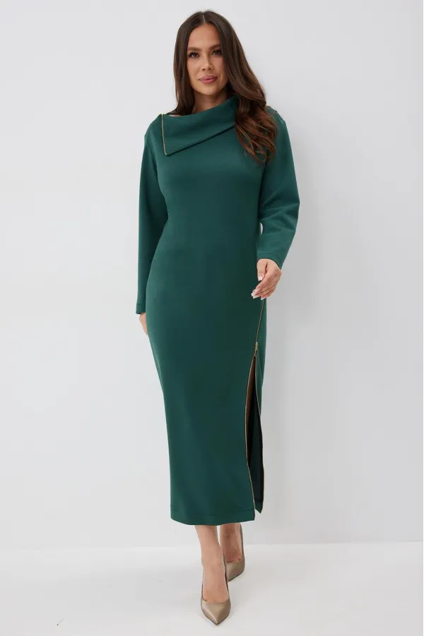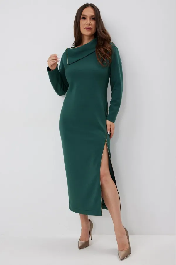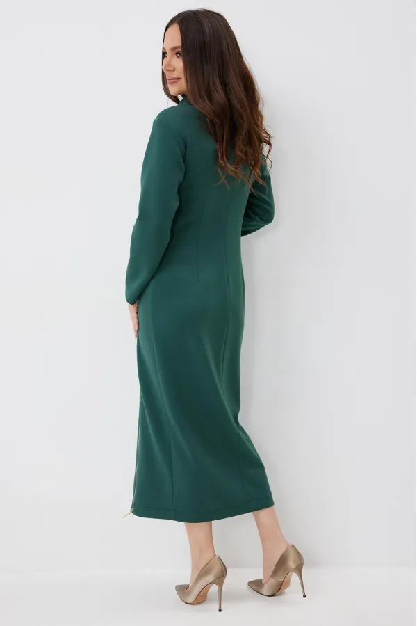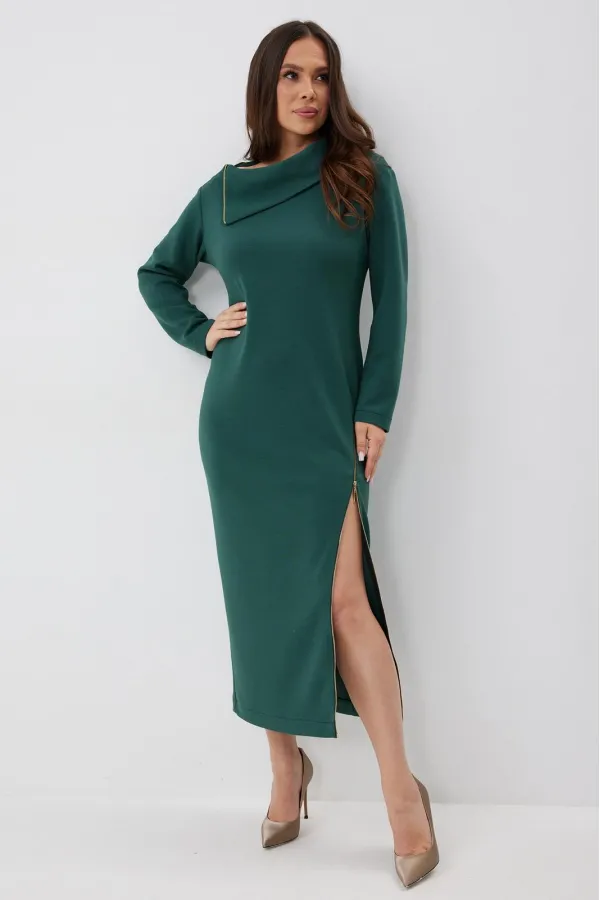 Элегантное и стильное платье миди полуприлегающего силуэта. Выполнено из приятного к телу комфортного гладкого трикотажного полотна. Рукав втачной, полной длины. Украшением платья являются функциональные тесьмы молнии. С их помощью можно стильно уложить воротник и отрегулировать вырез платья. Из лаконичного базового платье легко трансформируется в стильное и сексуальное. Длина платья от плечевого шва 127 см. Длина рукава 60 см.