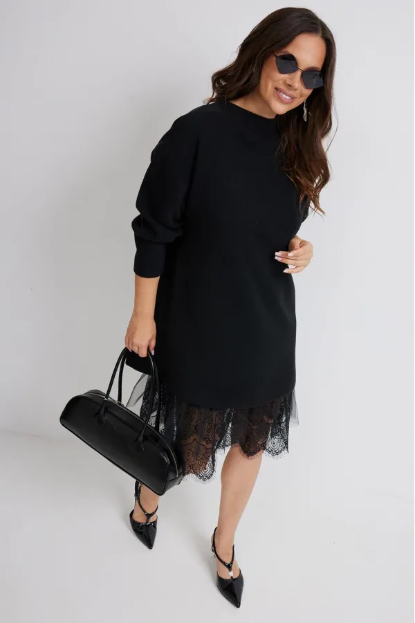 Стильный комплект из верхнего трикотажного платья и нижнего платья-комбинации. Верхнее платье свободного прямого кроя с длинным рукавом. Выполнено из приятного к телу трикотажного полотна средней плотности, который прекрасно держит форму. Нижнее платье-комбинация выполнено из нежного трикотажного полотна, дополненного красивым кружевом и фатином. Комбинация на тонких регулируемых бретелях. Длина верхнего платья от плечевого шва 81 см. Длина рукава 60 см. Длина нижнего платья 95 см.