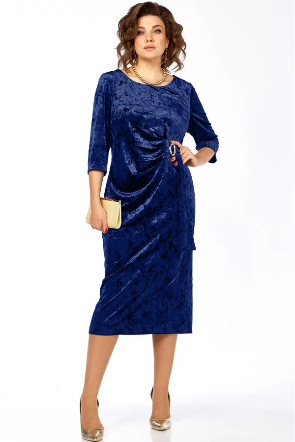 Платье женское, выполнено из бархатного полотна, длиной миди. Спинка со средним швом, шлицей на движение и потайной тесьмой-молнией. Перед с нагрудными вытачками из боковых швов, округлым вырезом горловины, и подрезом от правого плеча. Правая деталь переда присобирается в драпировку в области талии и закреплена декоративной пряжкой. Рукав втачной одношовный, длиной 3/4.