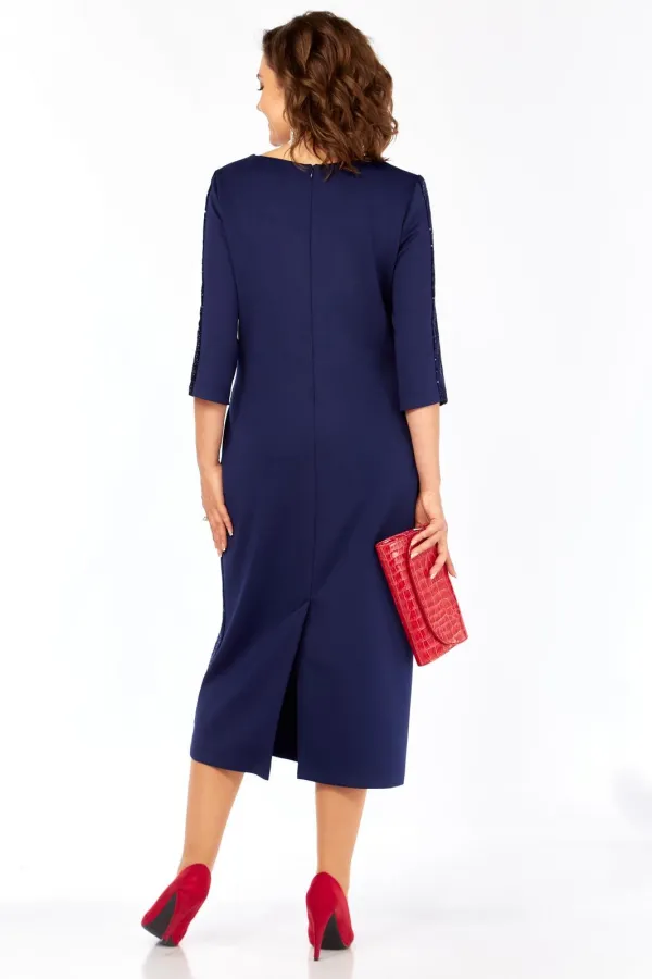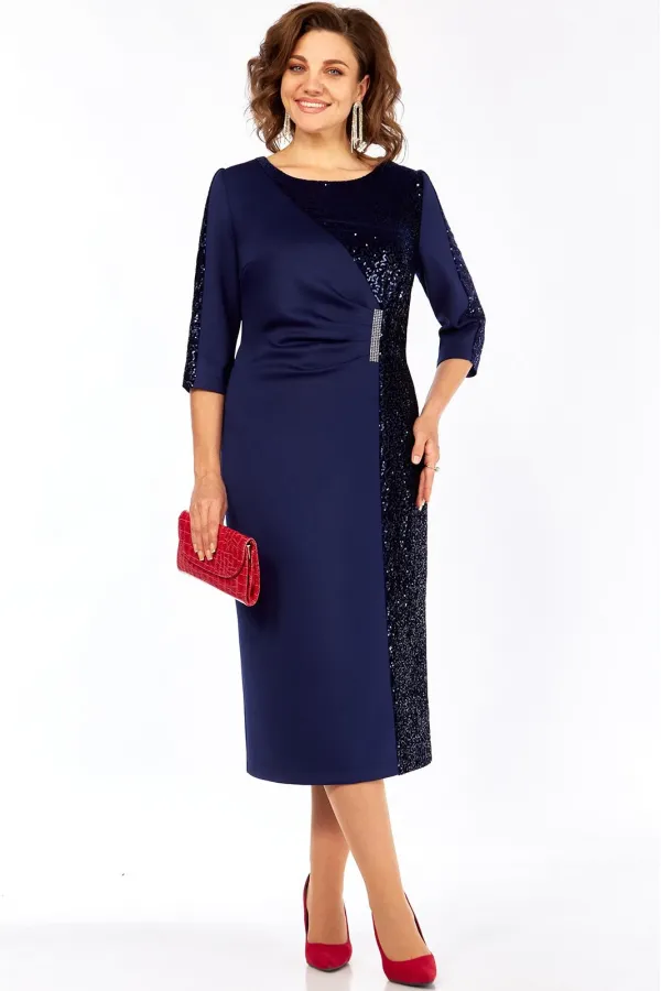 Платье женское, выполнено из 2-х видов тканей, длиной миди. Спинка со средним швом, шлицей на движение и потайной тесьмой-молнией. Перед с нагрудными вытачками из боковых швов, округлым вырезом горловины, и подрезом от правого плеча. Правая деталь переда присобирается в драпировку в области талии. Левая деталь переда из отделочной ткани- бархата с пайетками. Рукав втачной одношовный, длиной 3/4, с лампасом из отделочной ткани.