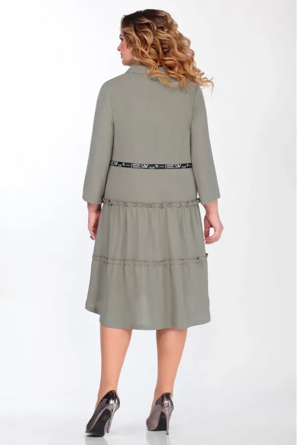 Платье женское, силуэт трапеция. Застежка центральная на молнию. Воротник стойка. По переду прорезные карманы с листочкой. По спинке два присборенных волана и декоративная тесьма настрочена по линии талии. Рукав втачной одношовный.Длина платья по спинке 108см, длина рукава 49,5см. Реальные замеры изделия 52 ог-110см, от-108см, 54 ог-114см, от-112см, 56 ог-118см, от-116см, 58 ог-122см, от-120см.
