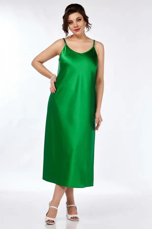 Платье полуприлегающего силуэта, из плотной атласной ткани. Длина миди, с нагрудными вытачками из боковых швов и с округлым вырезом горловины по переду и спинке, на тонких регулирующихся бретелях