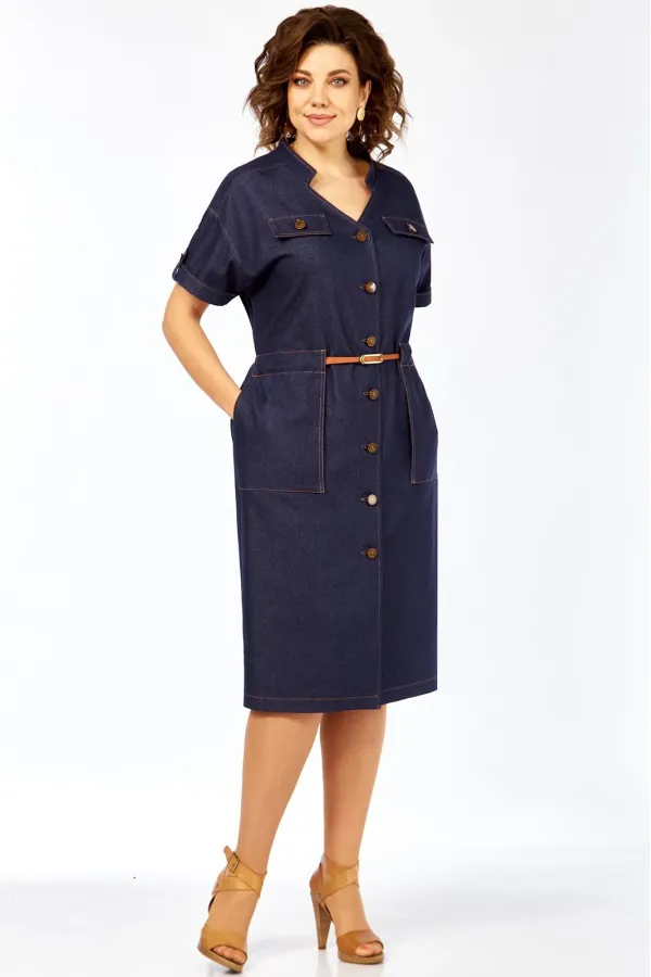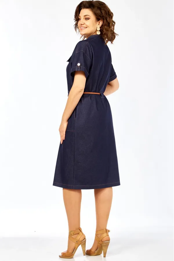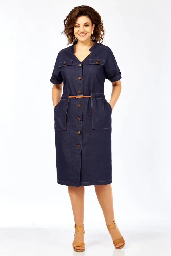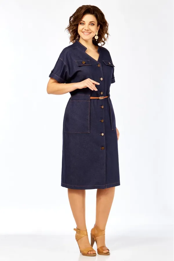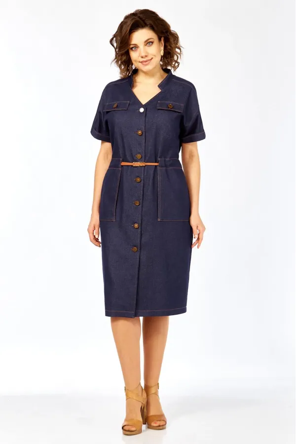 Платье женское прямого силуэта с коротким рукавом, рубашечного типа со спущенной линией плеча. Рукав с небольшим отворотом и патой. В плечевом обрезная кокетка. Перед платья с центральной бортовой застежкой на 7 пуговиц. Горловина платья V-образной формы с воротником стойкой. По переду расположены 2 клапана на линии груди и 2 накладных кармана на линии бедер. На клапанах, патах и рукавах пришиты пуговицы. Сквозь накладных карманов по линии талии продевается съемный пояс.