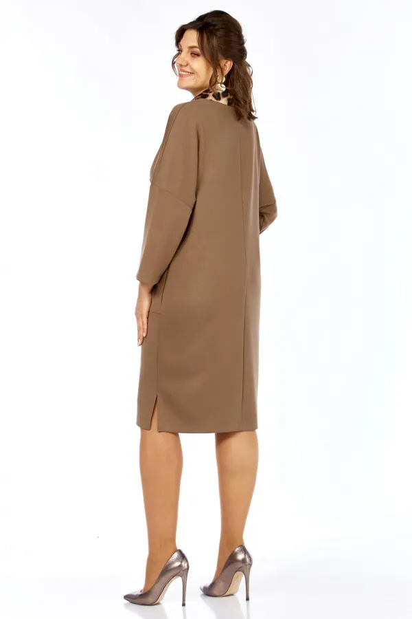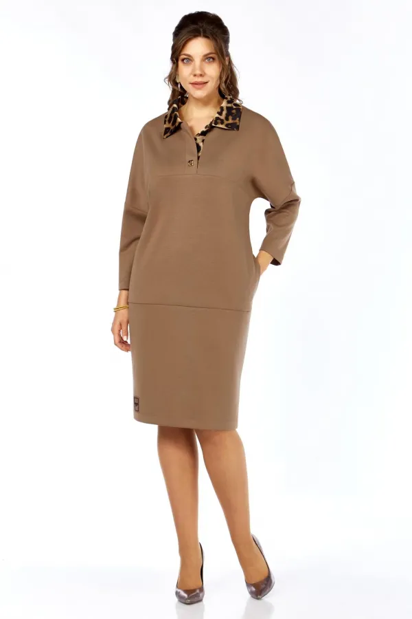 Платье женское прямого силуэта, выполнено из 2-х основных материалов(кожа+трикотаж) и отделочного полотна. Платье с рукавами длиной 3/4 на спущенной линии плеча, с разрезами в боковых швах и карманами. Перед платья с отрезной кокеткой и подрезом ниже линии бедер. Округлый вырез горловины, отрезные планки до подреза по переду и стояче-отложной воротник. На верхней планке пришита декоративная пуговица. Воротник и нижняя планка из отделочного материала. Спинка платья со средним швом.