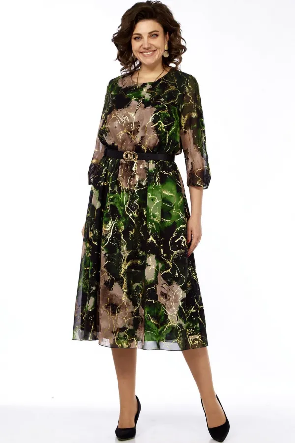 Платье женское, нарядное, выполнено из шифоновой ткани, на трикотажной подкладке. Платье отрезное по талии, в линию подреза вставлена резинка. Перед с нагрудными вытачками из боковых швов и округлым вырезом горловины. Рукав втачной 3/4, с разрезом от плеча и до низа рукава, в разрезе рукава от низа имеется сборка. Длина платья 126см, длина рукава 48 см