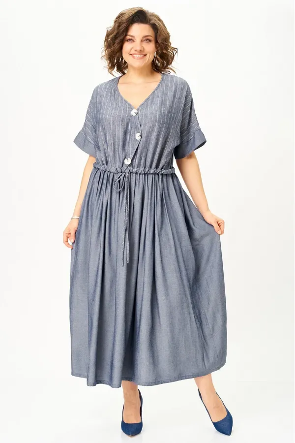 Верх выполнен из лёгкого льна с деликатной полоской, низ — из струящейся вискозы, благодаря чему платье красиво движется при ходьбе и создаёт ощущение лёгкости.